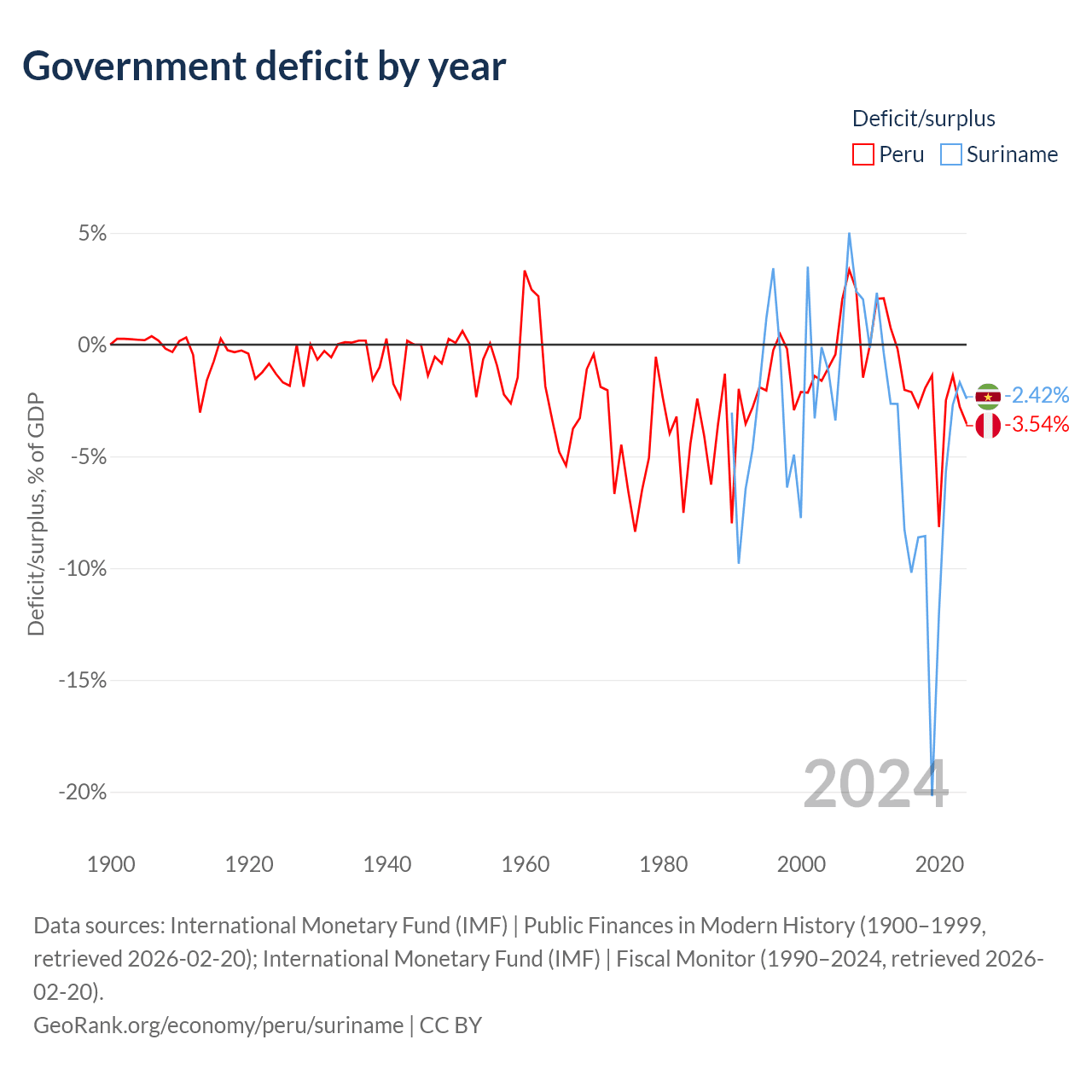 Peru has a GDP of $289B compared to $4.42B for Suriname, ranking 49/197 and 164/197 by economy size, respectively.