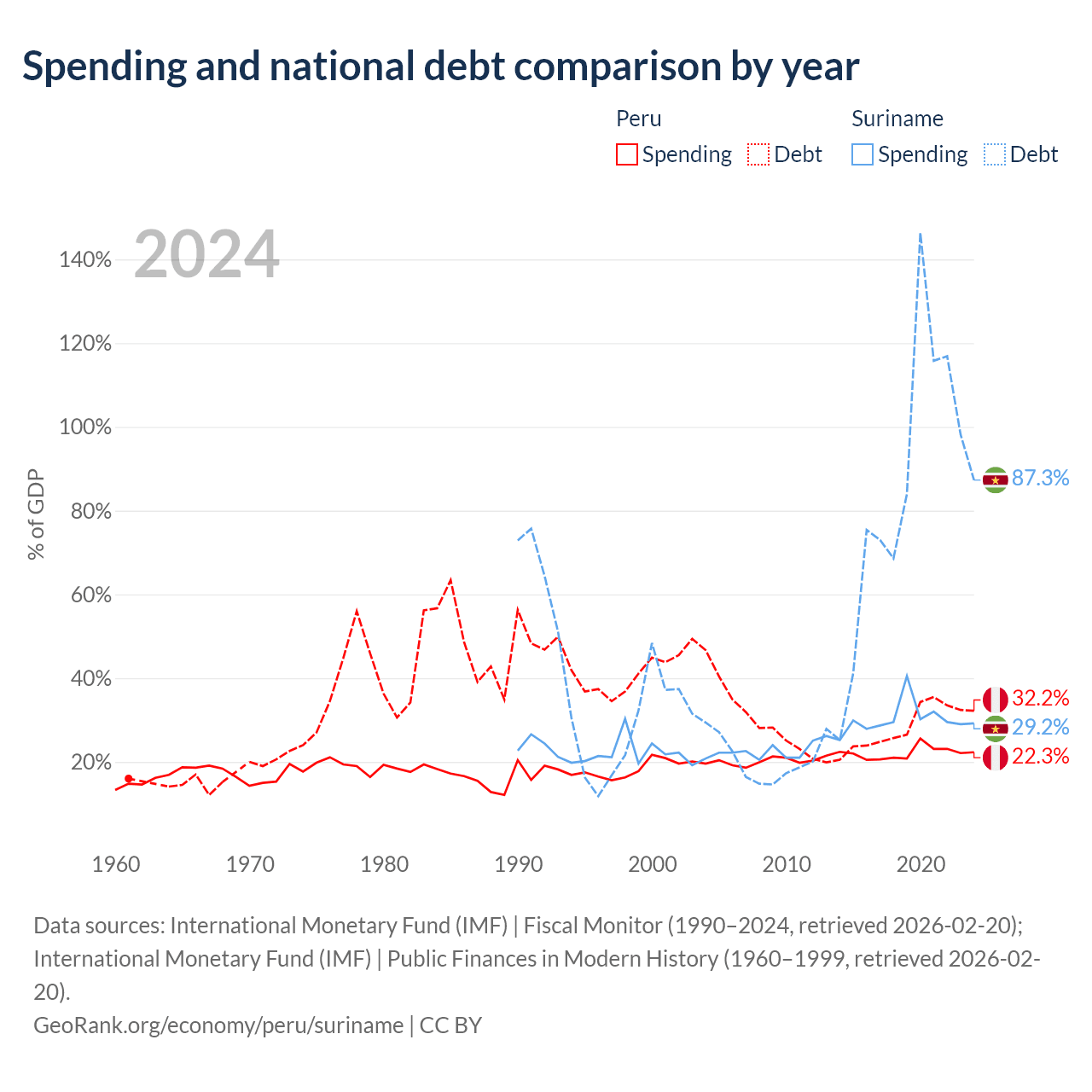 Peru has $93B in government debt (32.2% of GDP), compared to $3.86B (87.3% of GDP) in Suriname.