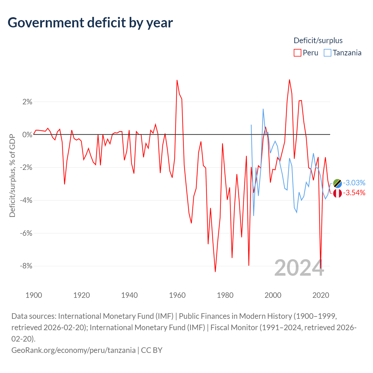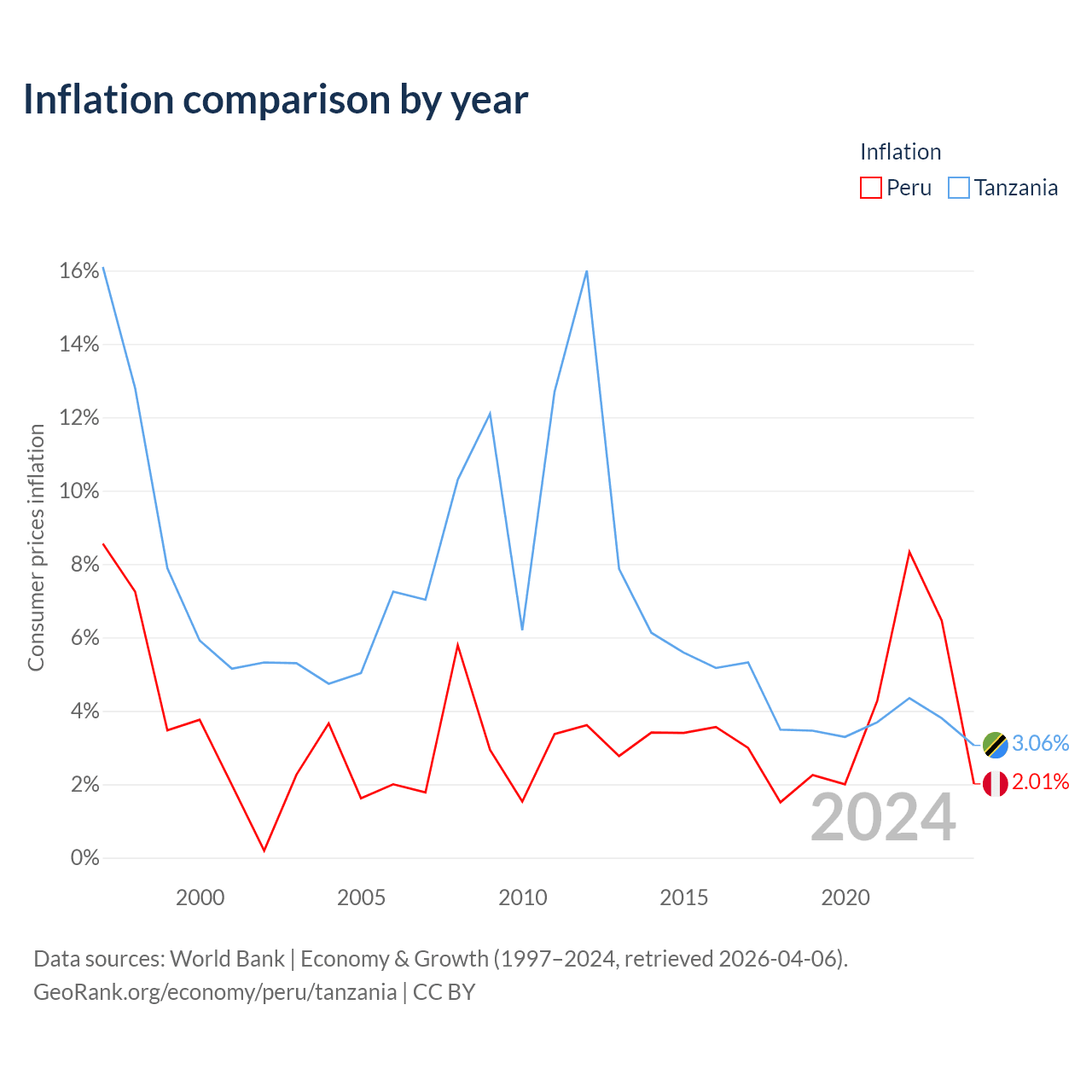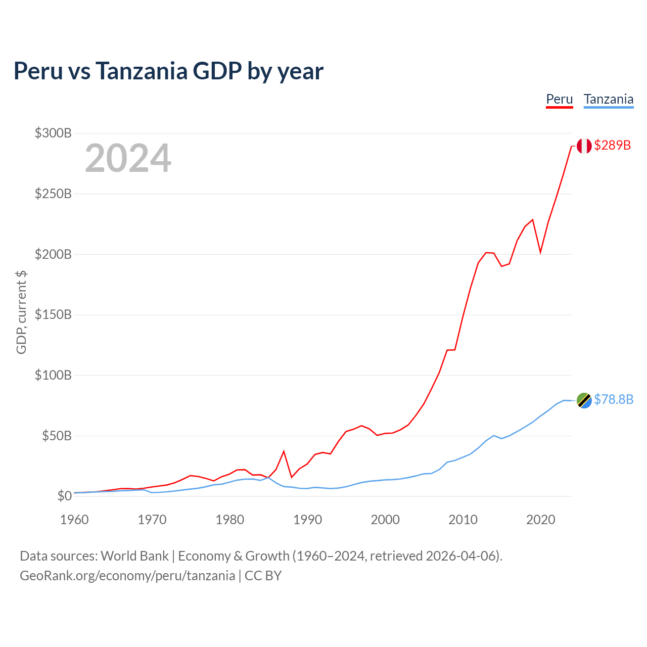Peru has a GDP of $289B compared to $78.8B for Tanzania, ranking 49/197 and 82/197 by economy size, respectively.