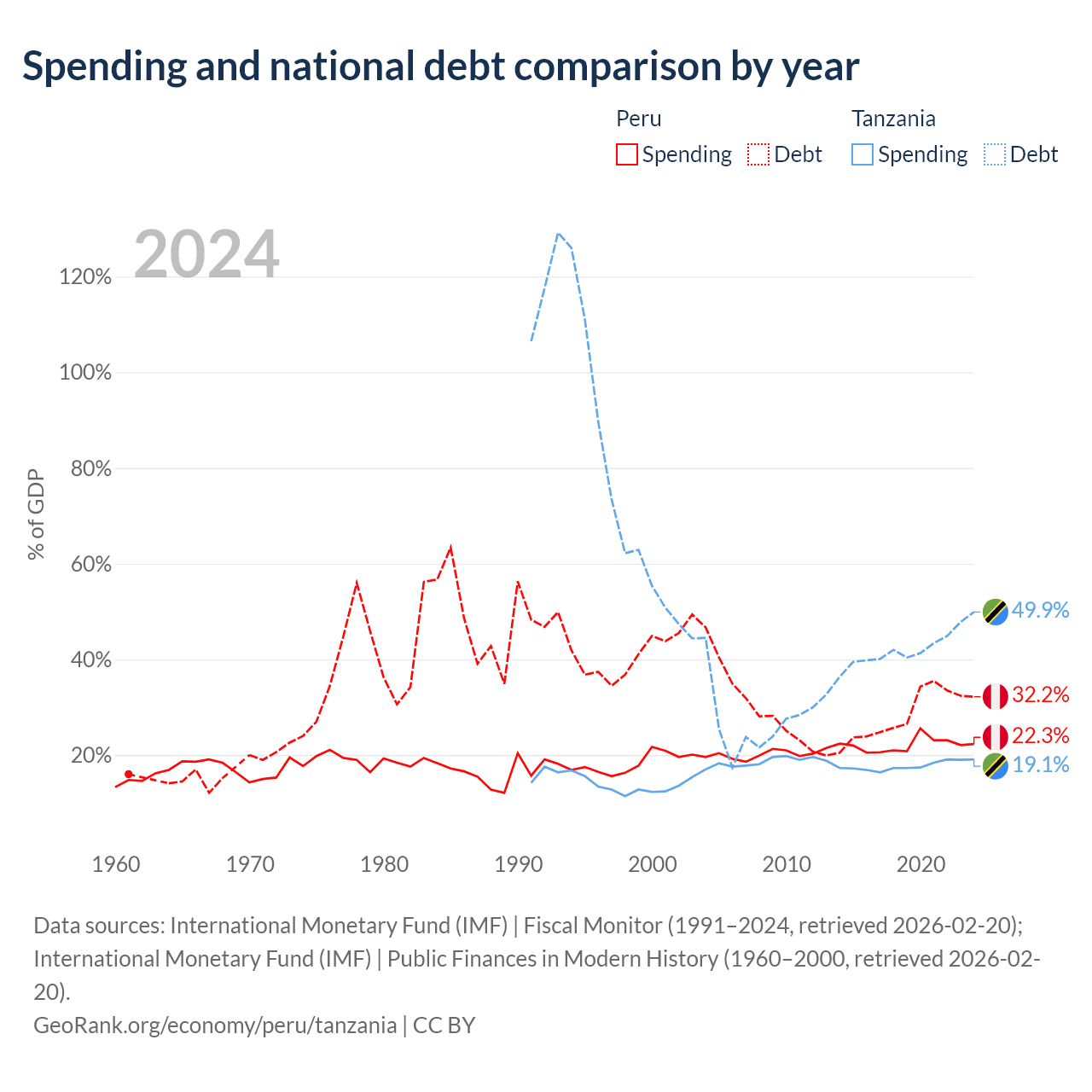 Peru has $93B in government debt (32.2% of GDP), compared to $39.3B (49.9% of GDP) in Tanzania.