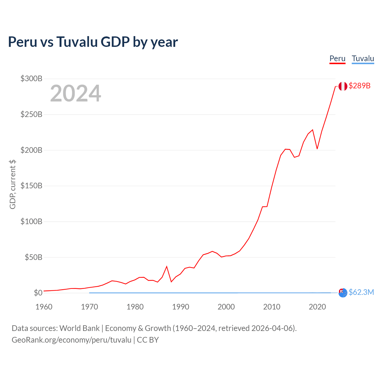 Peru has a GDP of $289B compared to $62.3M for Tuvalu, ranking 49/197 and 196/197 by economy size, respectively.