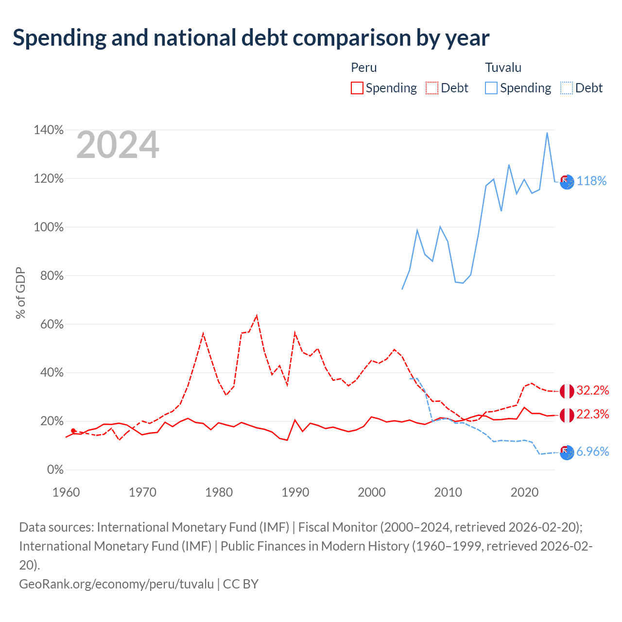 Peru has $93B in government debt (32.2% of GDP), compared to $4.15M (6.96% of GDP) in Tuvalu.