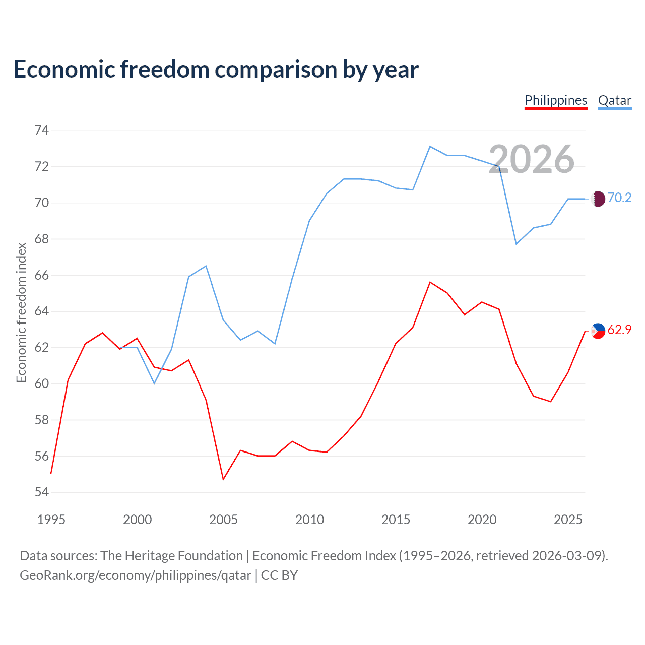 The Economic Freedom Index for the Philippines is 62.9, ranking 85/197, compared to 70.2 for Qatar, ranking 37/197. The chart above displays a comparison of annual changes in economic freedom indexes.