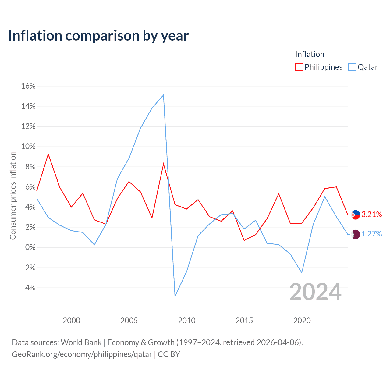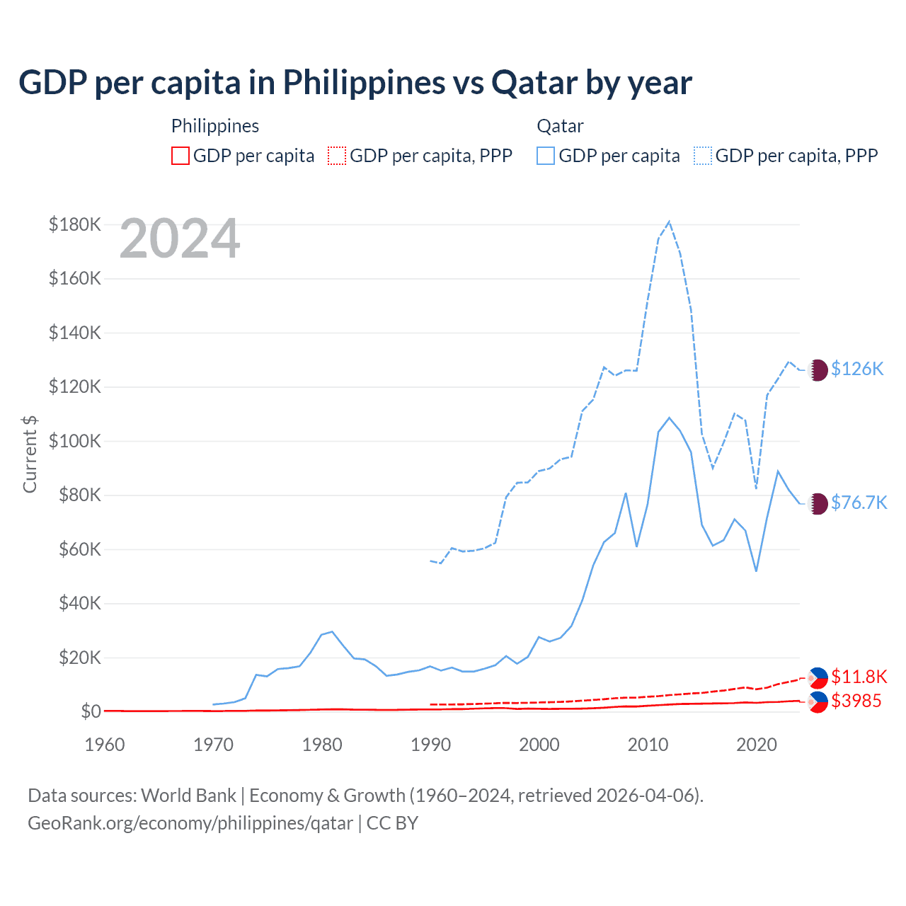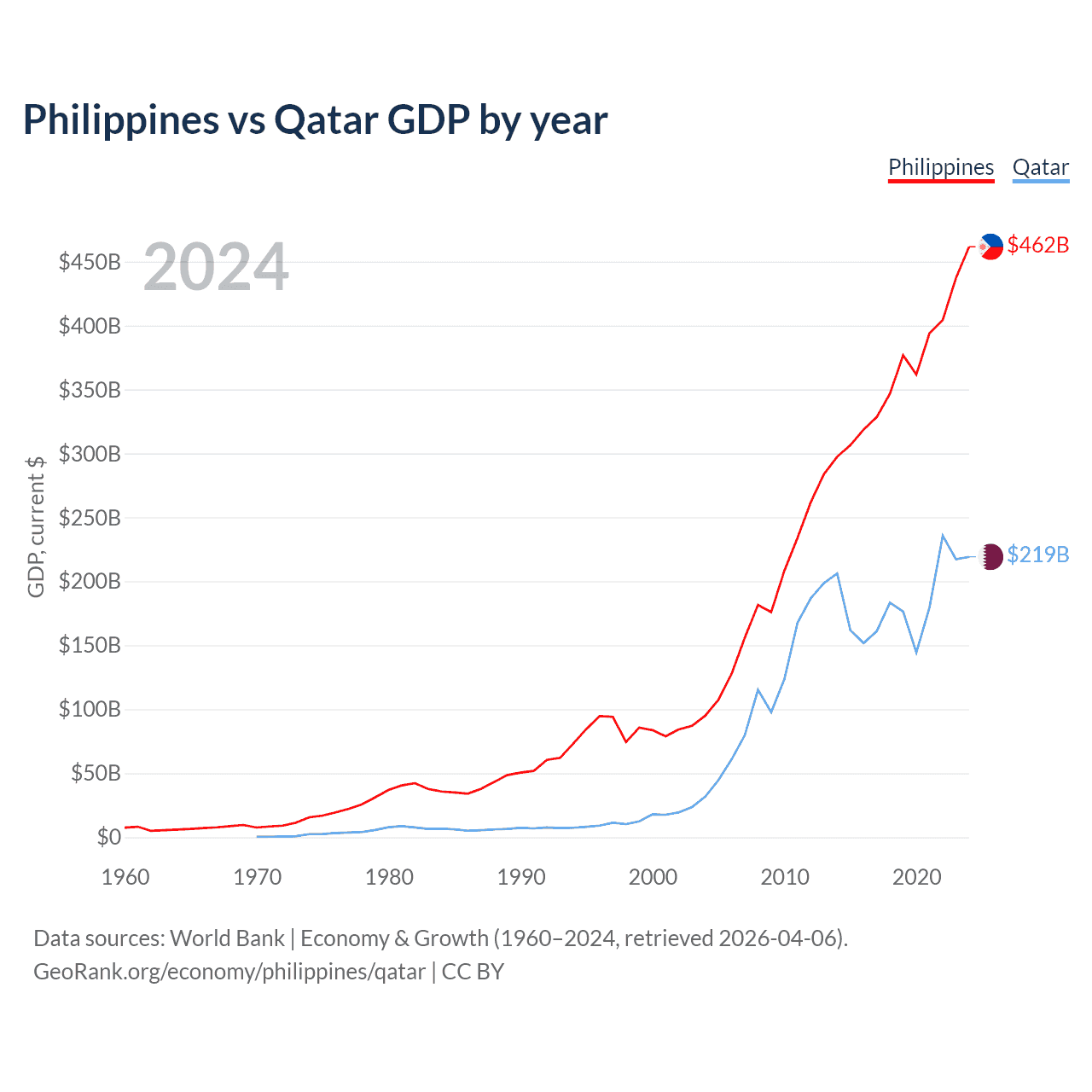 The Philippines has a GDP of $462B compared to $219B for Qatar, ranking 35/197 and 56/197 by economy size, respectively.