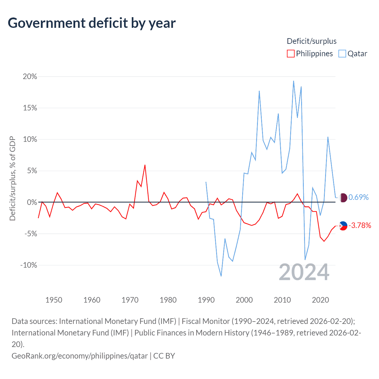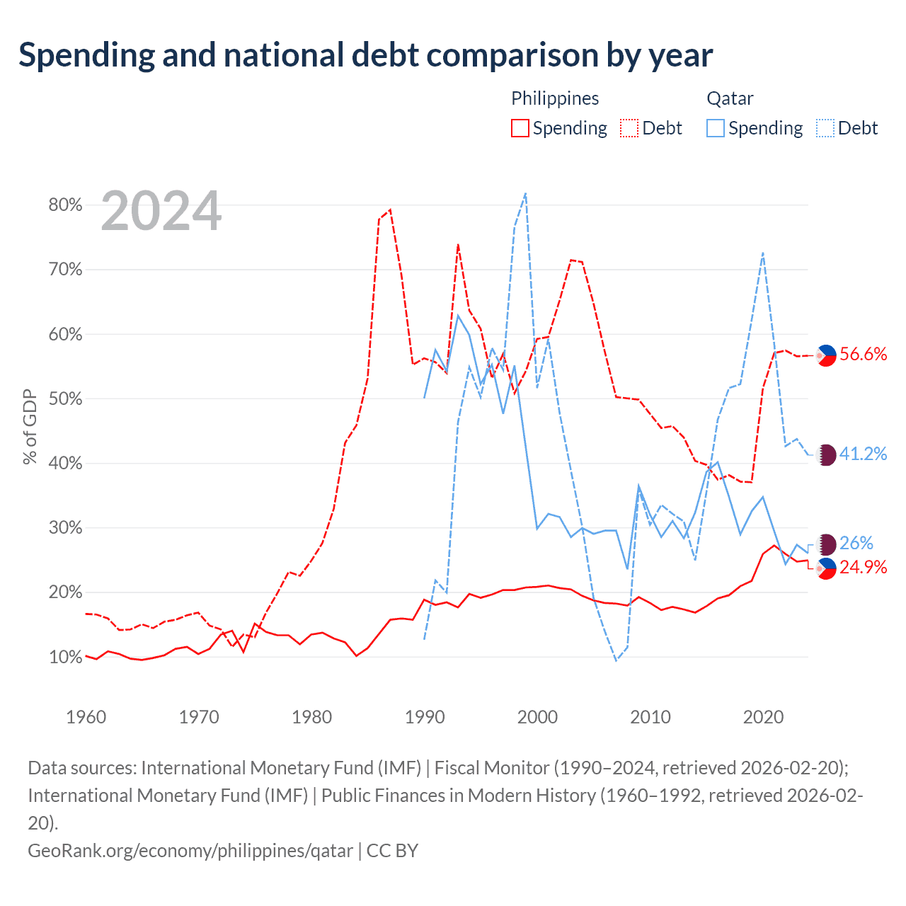 The Philippines has $261B in government debt (56.6% of GDP), compared to $90.2B (41.2% of GDP) in Qatar.