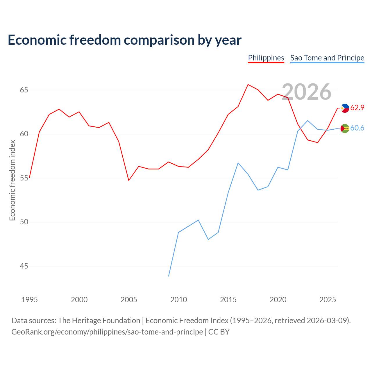 The Economic Freedom Index for the Philippines is 62.9, ranking 85/197, compared to 60.6 for Sao Tome and Principe, ranking 93/197. The chart above displays a comparison of annual changes in economic freedom indexes.