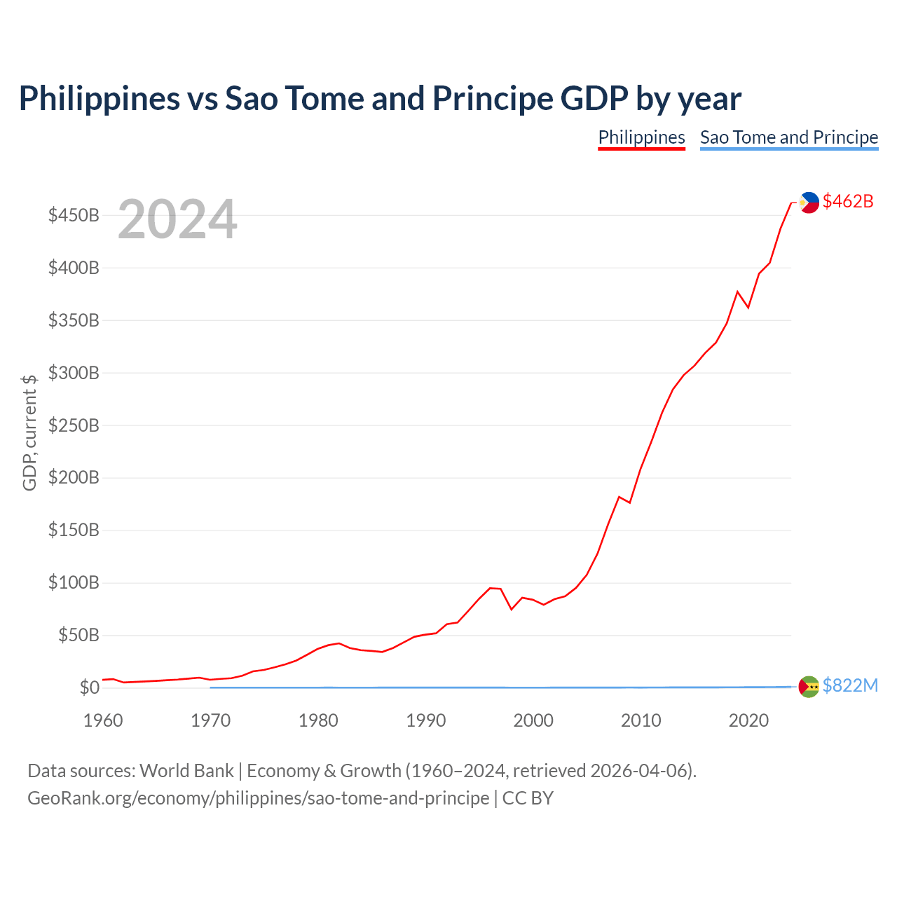 The Philippines has a GDP of $462B compared to $822M for Sao Tome and Principe, ranking 35/197 and 189/197 by economy size, respectively.