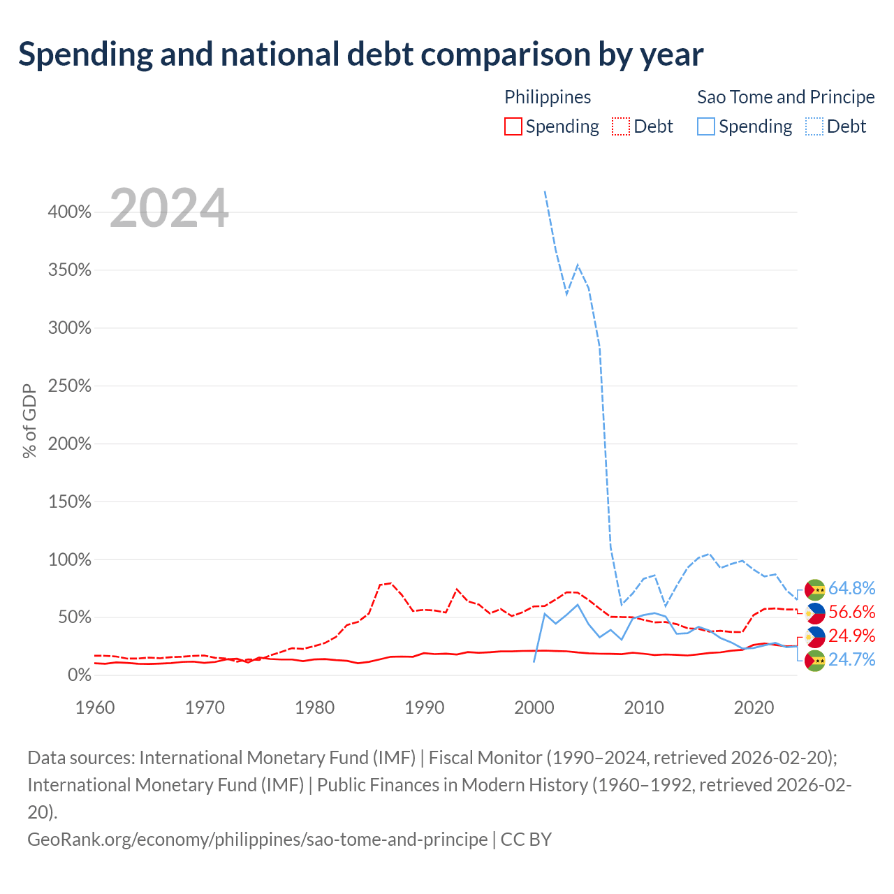 The Philippines has $261B in government debt (56.6% of GDP), compared to $533M (64.8% of GDP) in Sao Tome and Principe.
