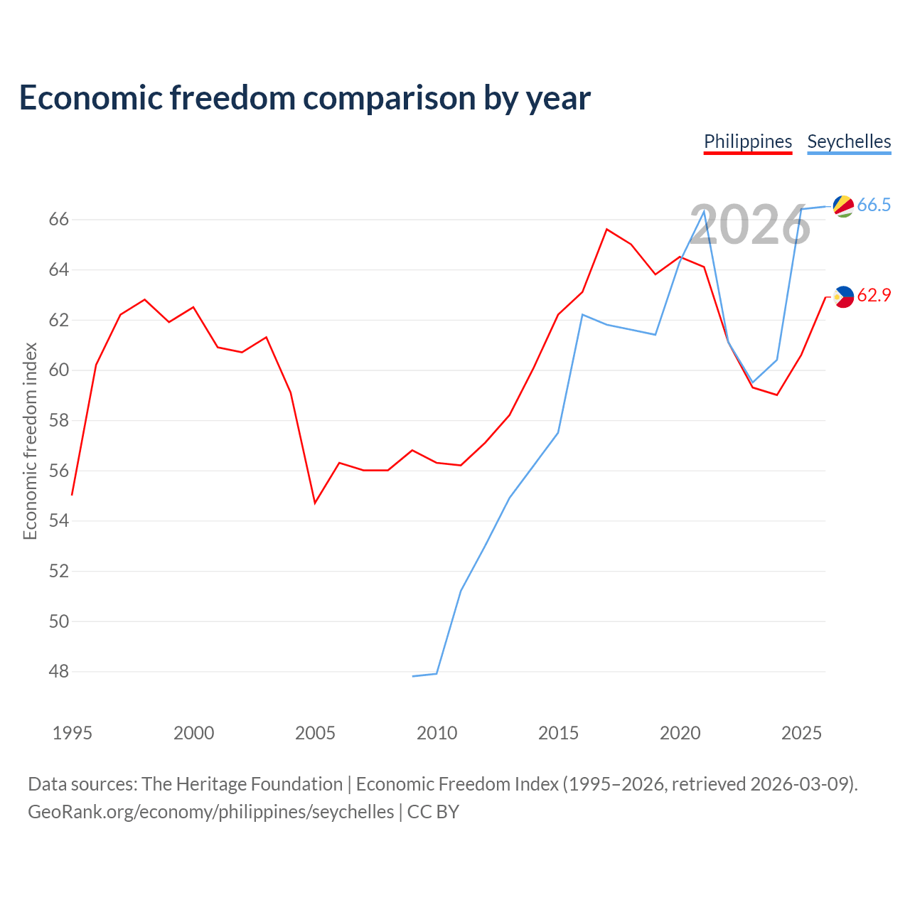 The Economic Freedom Index for the Philippines is 62.9, ranking 85/197, compared to 66.5 for the Seychelles, ranking 60/197. The chart above displays a comparison of annual changes in economic freedom indexes.