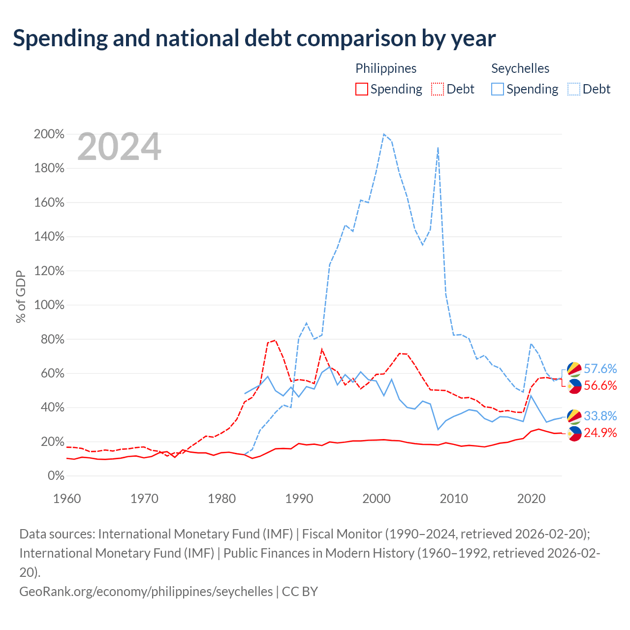 The Philippines has $261B in government debt (56.6% of GDP), compared to $1.25B (57.6% of GDP) in the Seychelles.