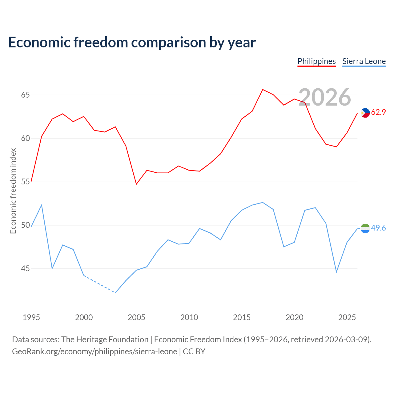 The Economic Freedom Index for the Philippines is 62.9, ranking 85/197, compared to 49.6 for Sierra Leone, ranking 165/197. The chart above displays a comparison of annual changes in economic freedom indexes.