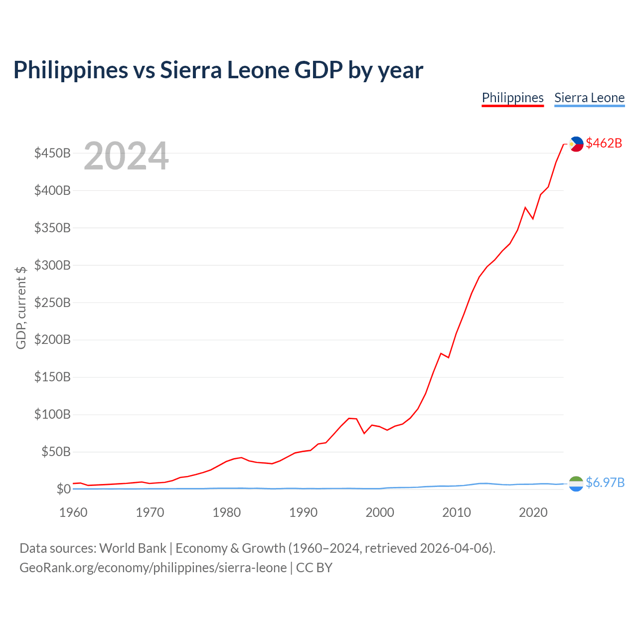 The Philippines has a GDP of $462B compared to $6.97B for Sierra Leone, ranking 35/197 and 160/197 by economy size, respectively.