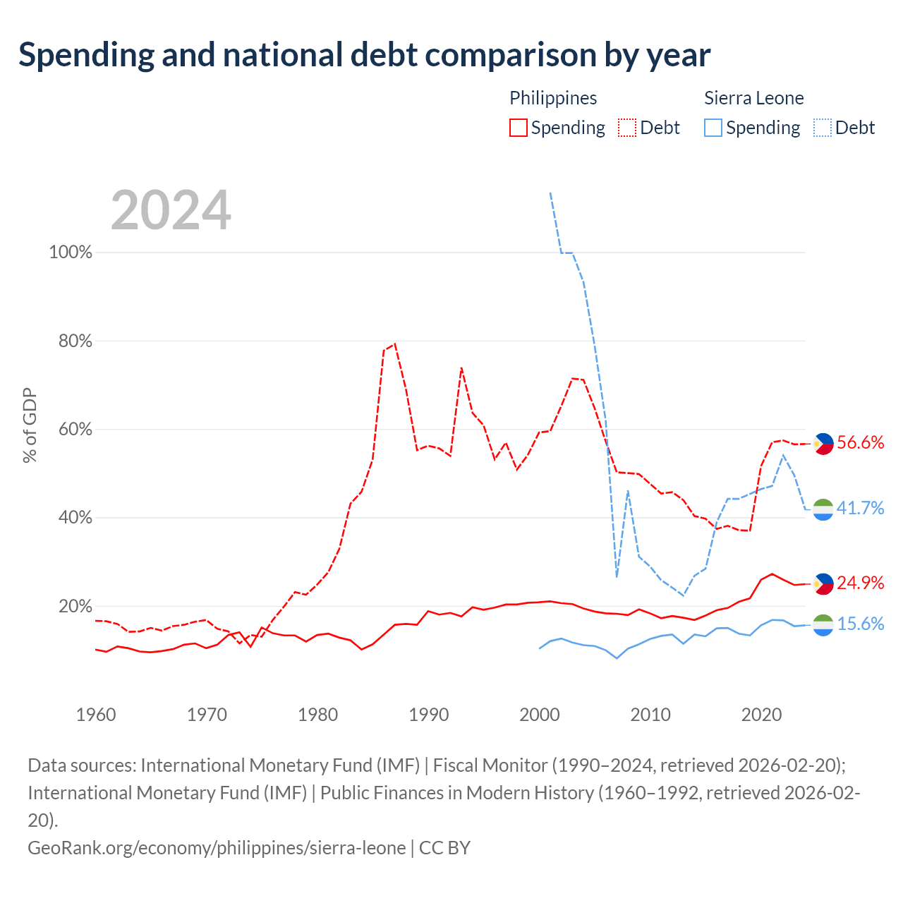 The Philippines has $261B in government debt (56.6% of GDP), compared to $2.91B (41.7% of GDP) in Sierra Leone.