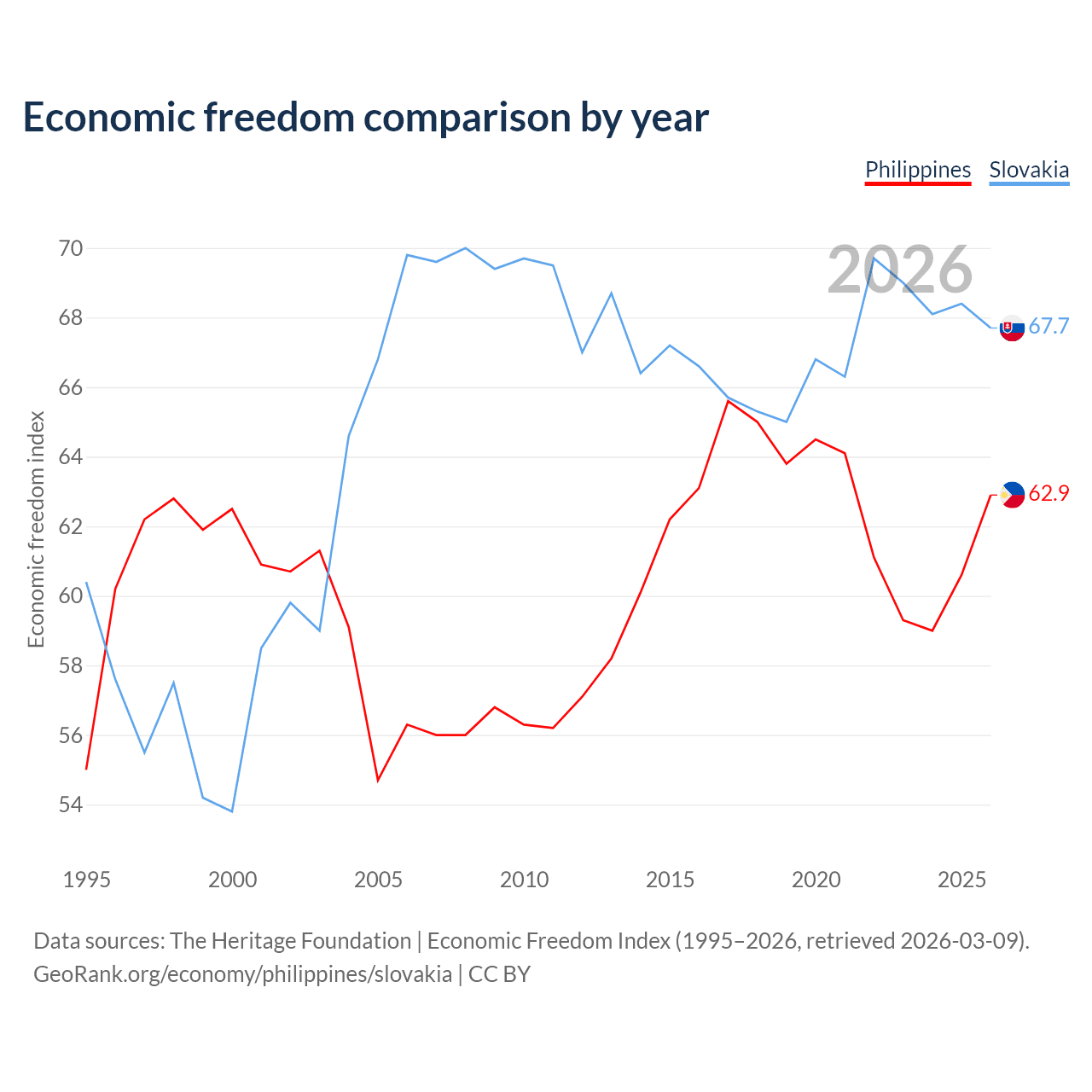 The Economic Freedom Index for the Philippines is 62.9, ranking 85/197, compared to 67.7 for Slovakia, ranking 54/197. The chart above displays a comparison of annual changes in economic freedom indexes.