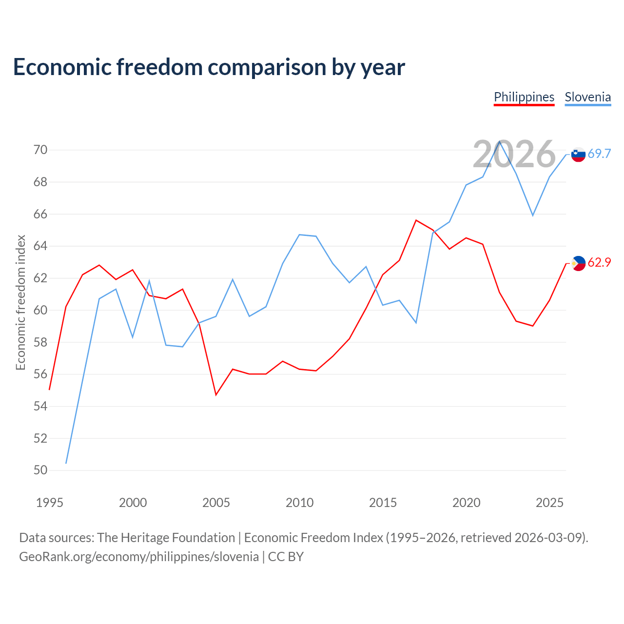 The Economic Freedom Index for the Philippines is 62.9, ranking 85/197, compared to 69.7 for Slovenia, ranking 40/197. The chart above displays a comparison of annual changes in economic freedom indexes.