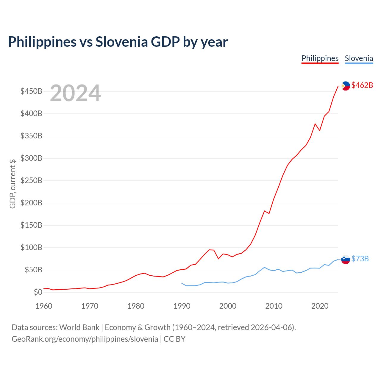 The Philippines has a GDP of $462B compared to $73B for Slovenia, ranking 35/197 and 86/197 by economy size, respectively.