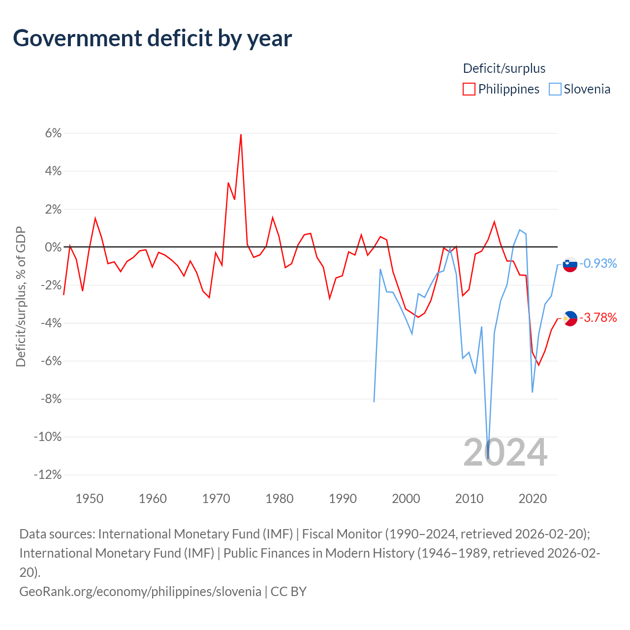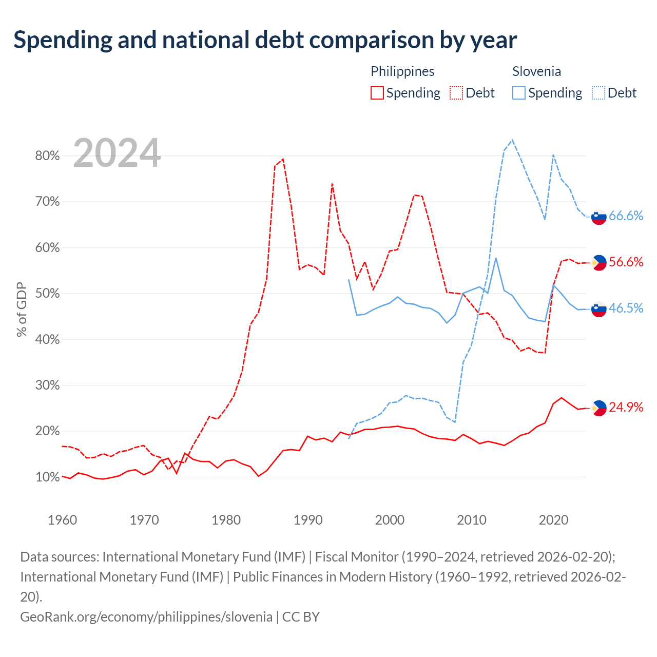 The Philippines has $261B in government debt (56.6% of GDP), compared to $48.6B (66.6% of GDP) in Slovenia.