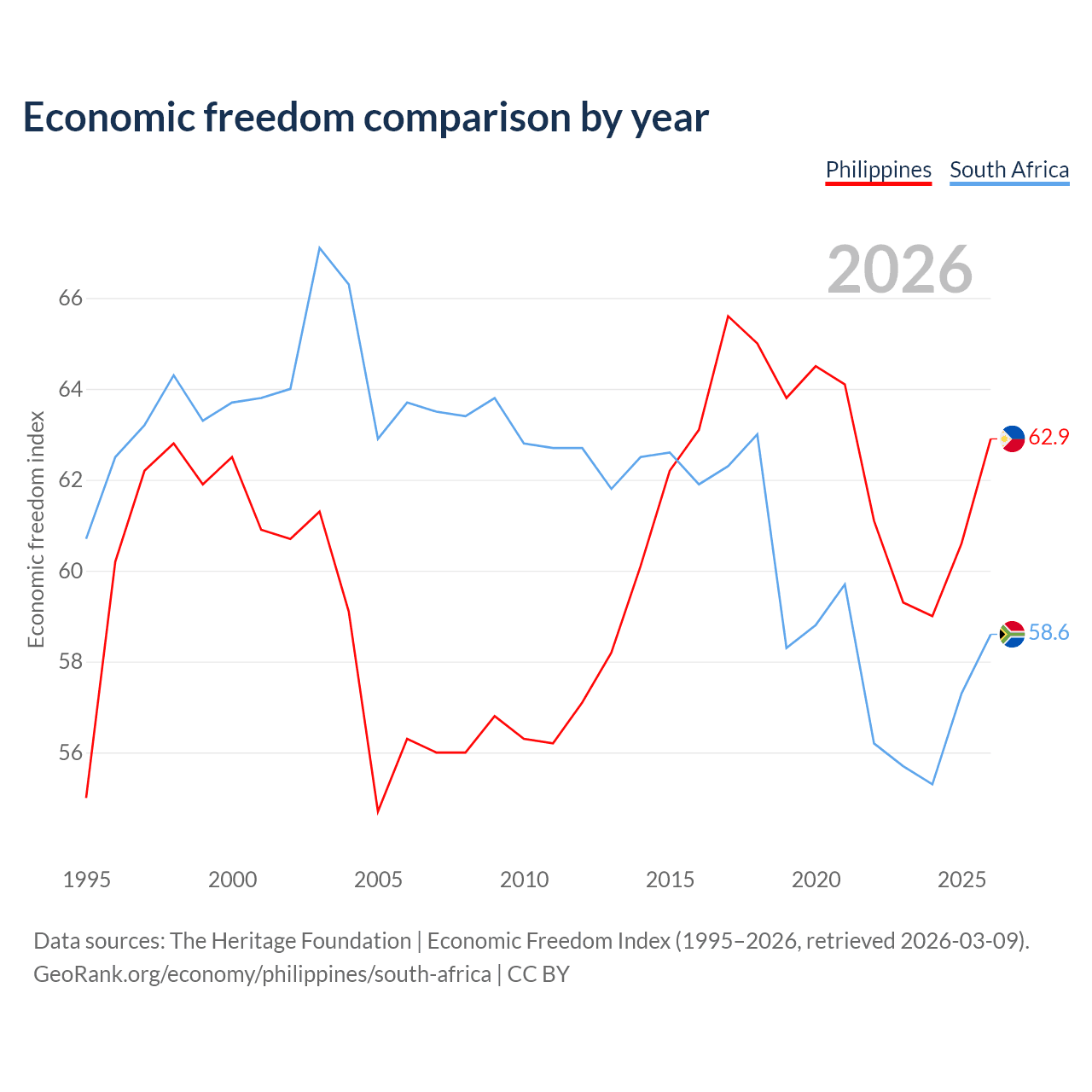 The Economic Freedom Index for the Philippines is 62.9, ranking 85/197, compared to 58.6 for South Africa, ranking 110/197. The chart above displays a comparison of annual changes in economic freedom indexes.