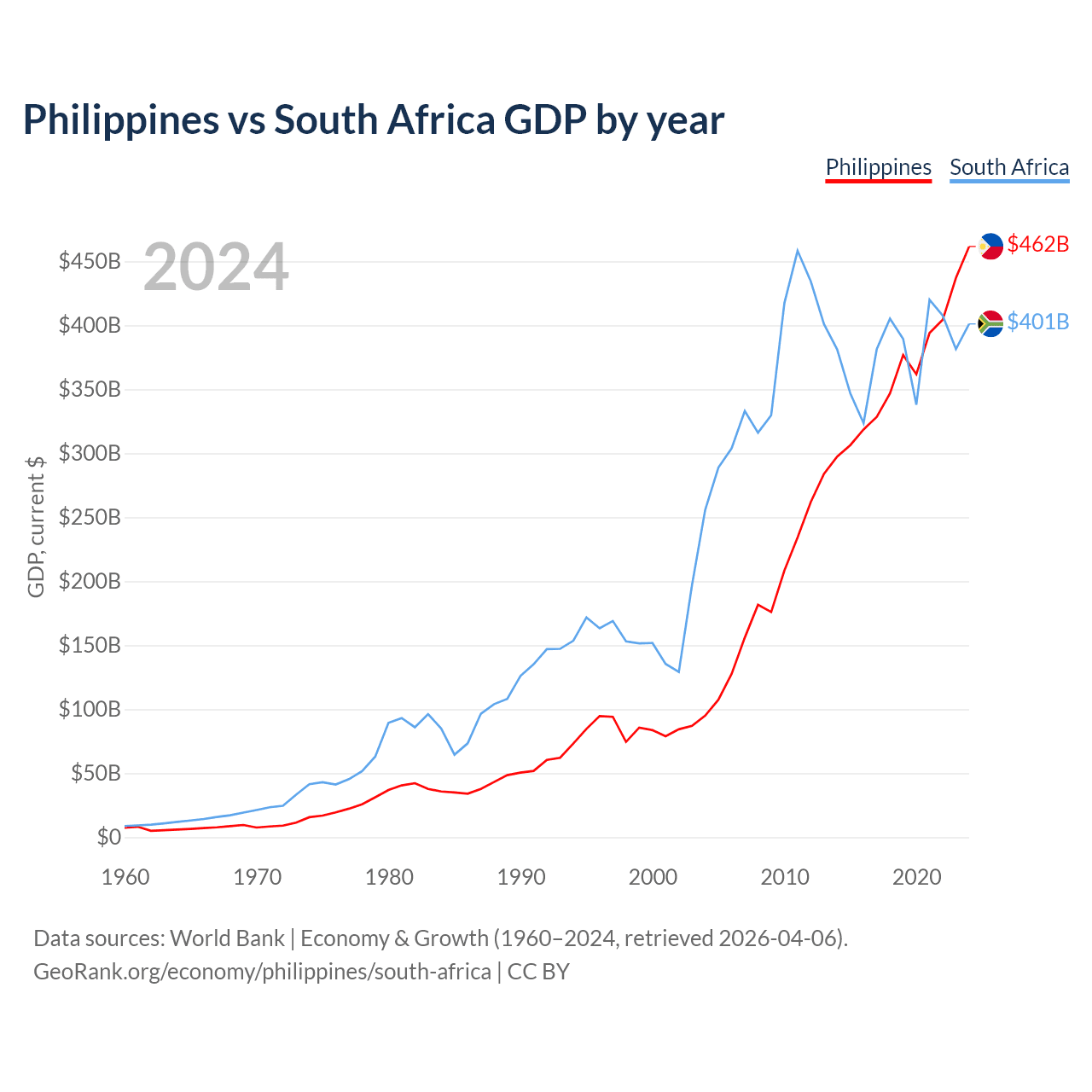 The Philippines has a GDP of $462B compared to $401B for South Africa, ranking 35/197 and 40/197 by economy size, respectively.
