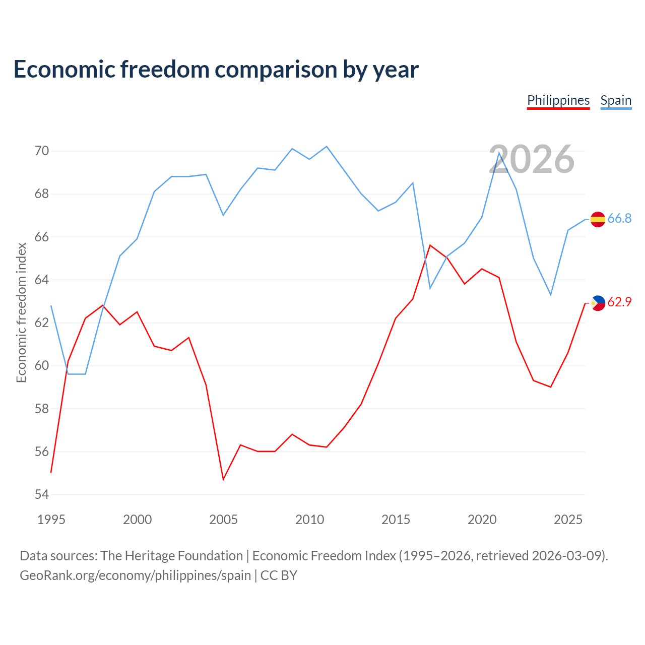 The Economic Freedom Index for the Philippines is 62.9, ranking 85/197, compared to 66.8 for Spain, ranking 59/197. The chart above displays a comparison of annual changes in economic freedom indexes.