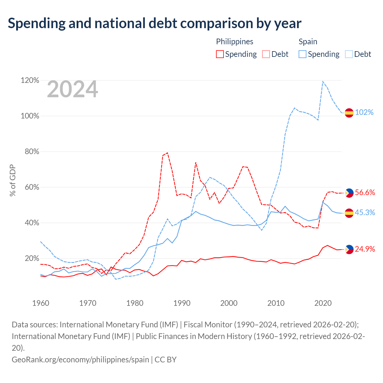 The Philippines has $261B in government debt (56.6% of GDP), compared to $1.75T (101.6% of GDP) in Spain.