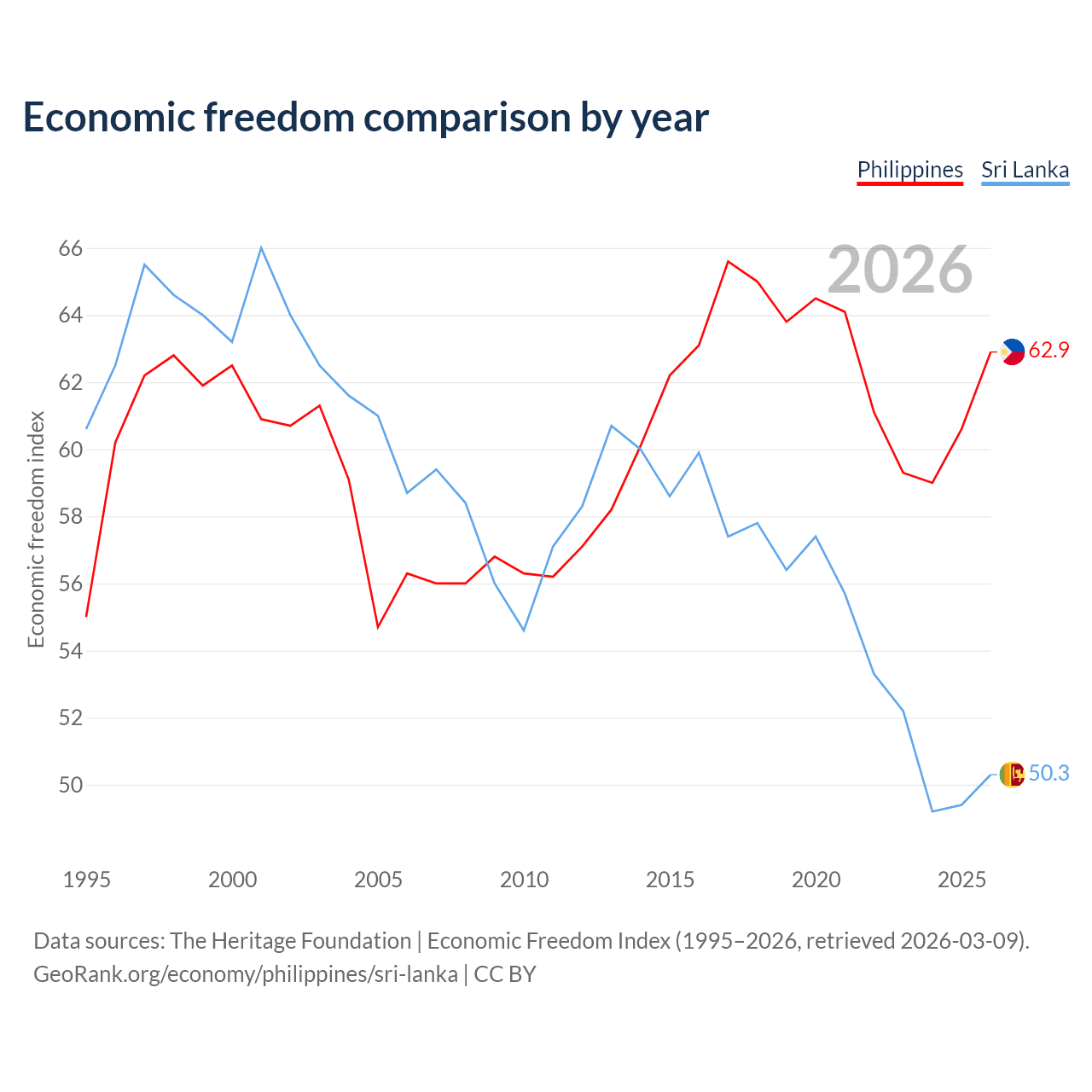 The Economic Freedom Index for the Philippines is 62.9, ranking 85/197, compared to 50.3 for Sri Lanka, ranking 162/197. The chart above displays a comparison of annual changes in economic freedom indexes.