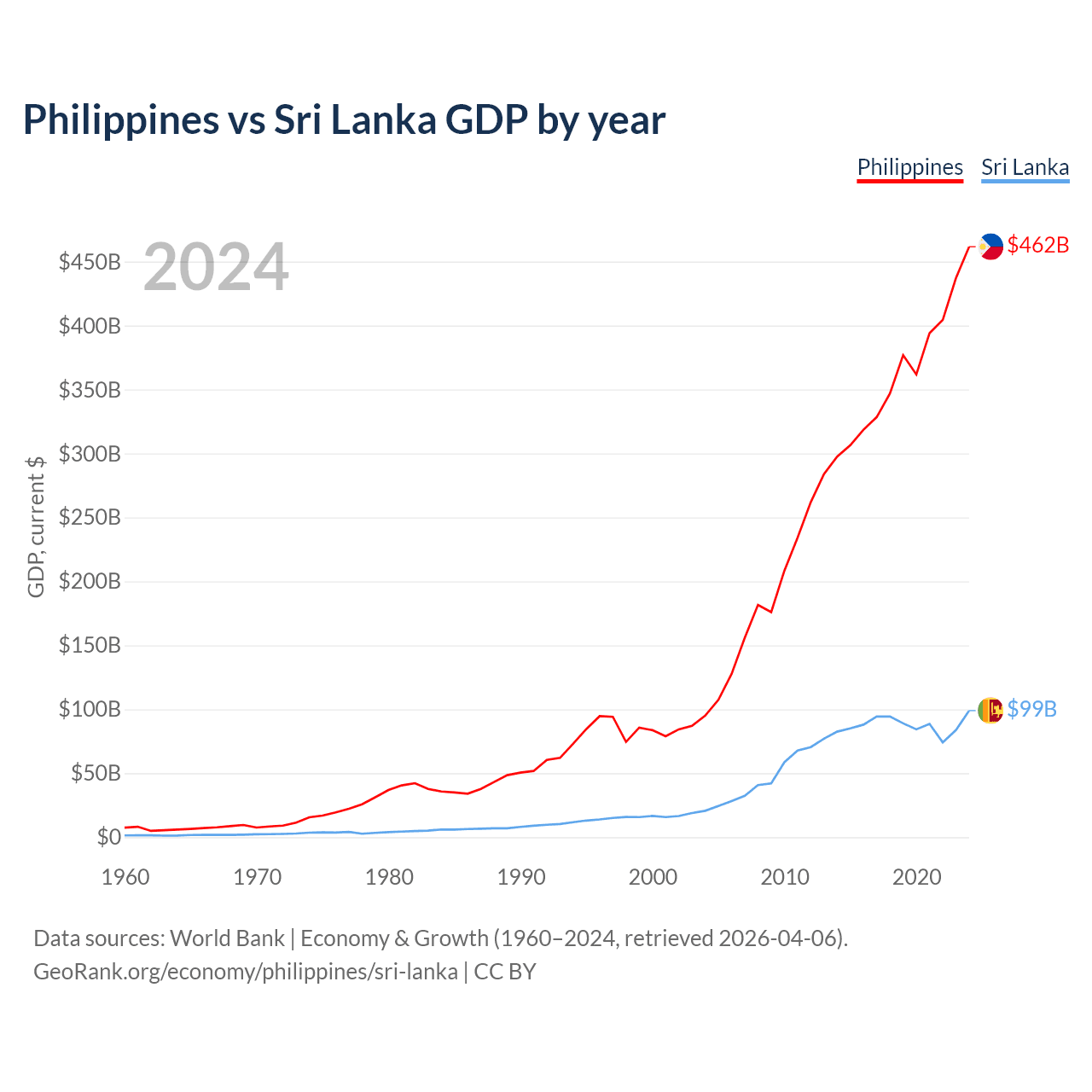 The Philippines has a GDP of $462B compared to $99B for Sri Lanka, ranking 35/197 and 72/197 by economy size, respectively.