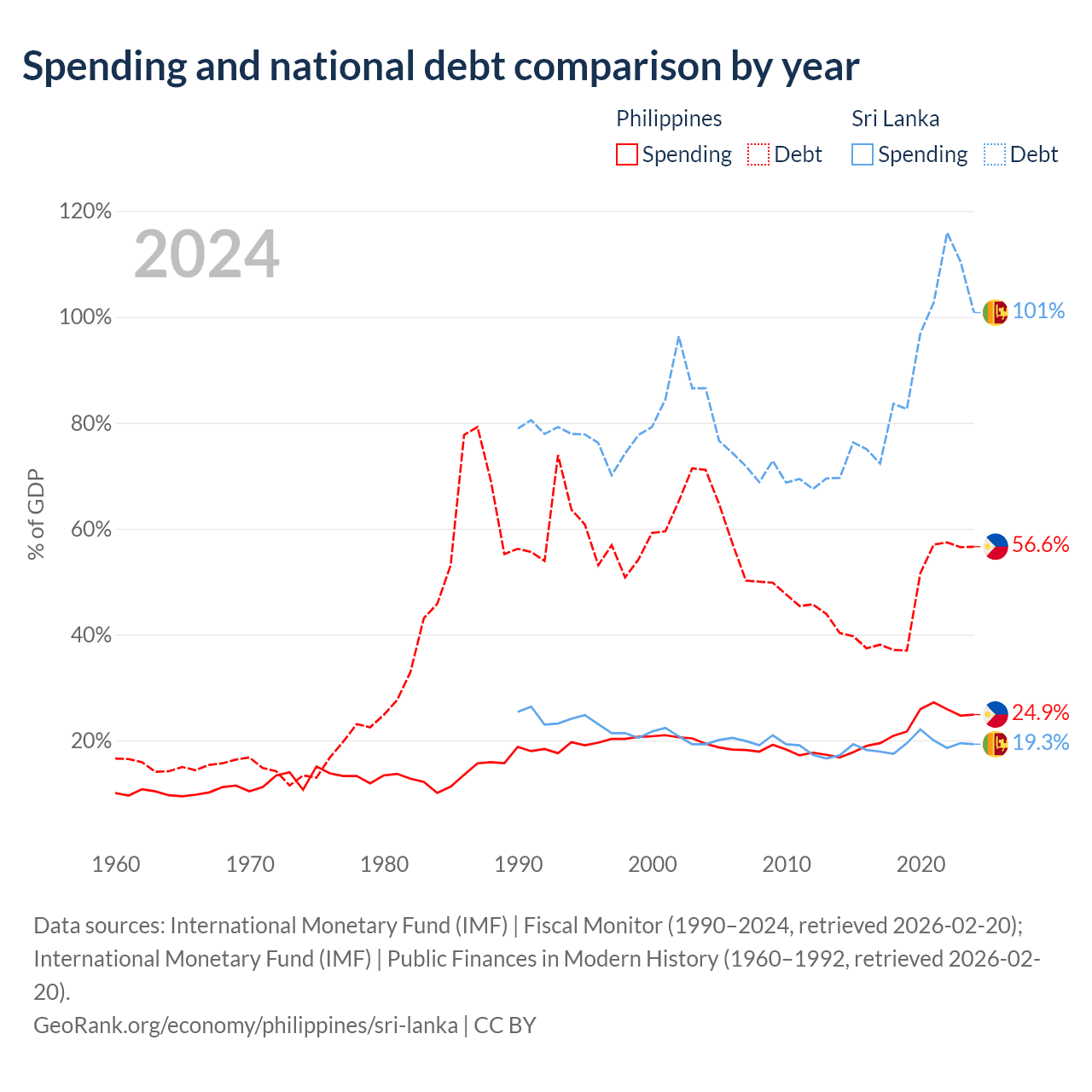 The Philippines has $261B in government debt (56.6% of GDP), compared to $99.8B (100.8% of GDP) in Sri Lanka.