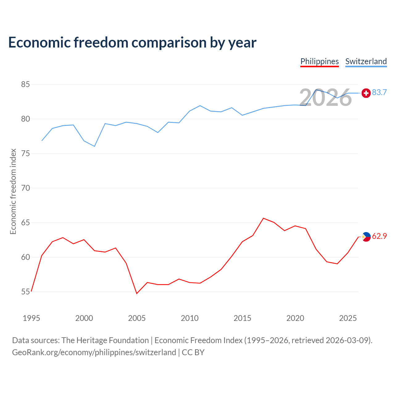 The Economic Freedom Index for the Philippines is 62.9, ranking 85/197, compared to 83.7 for Switzerland, ranking 2/197. The chart above displays a comparison of annual changes in economic freedom indexes.