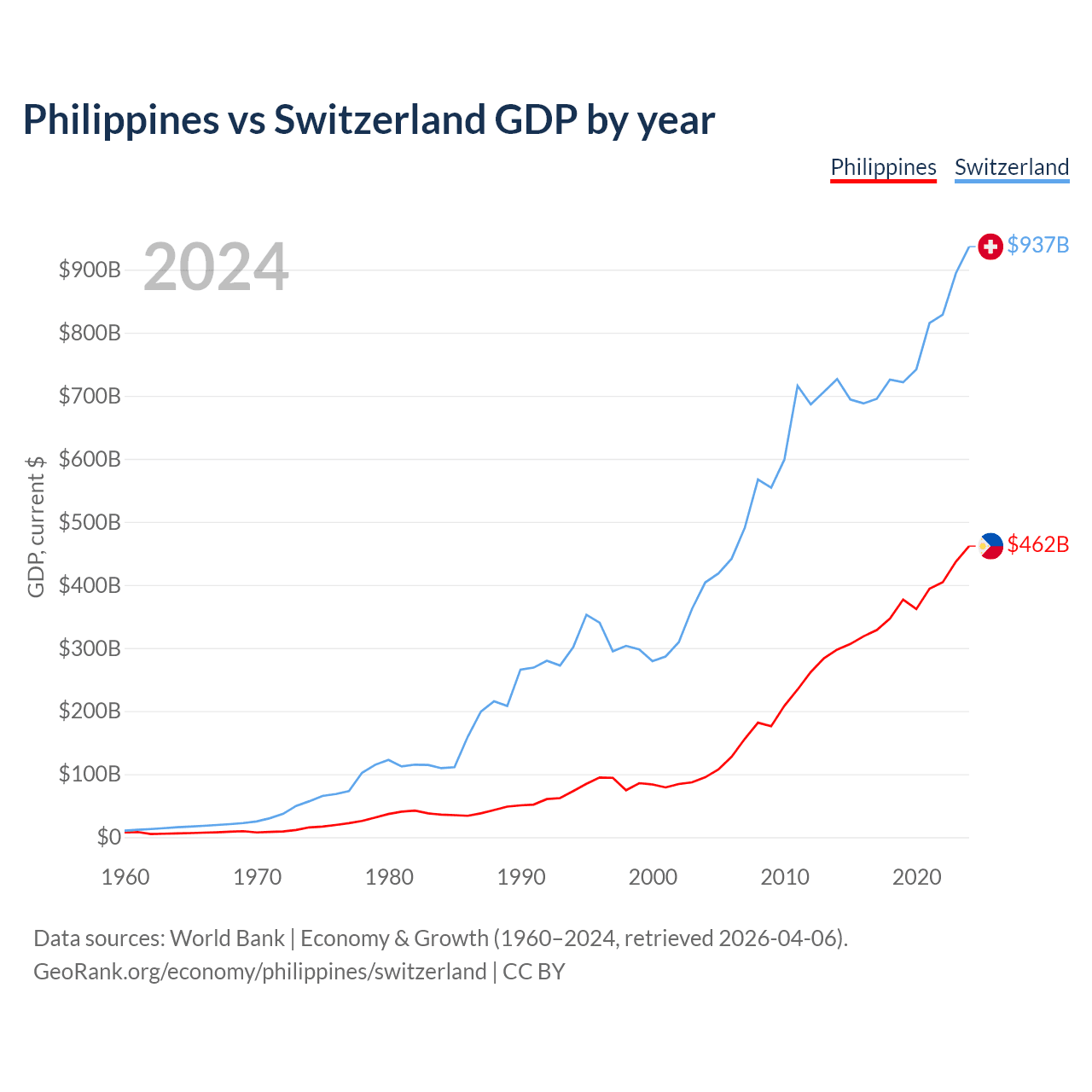 The Philippines has a GDP of $462B compared to $937B for Switzerland, ranking 35/197 and 20/197 by economy size, respectively.