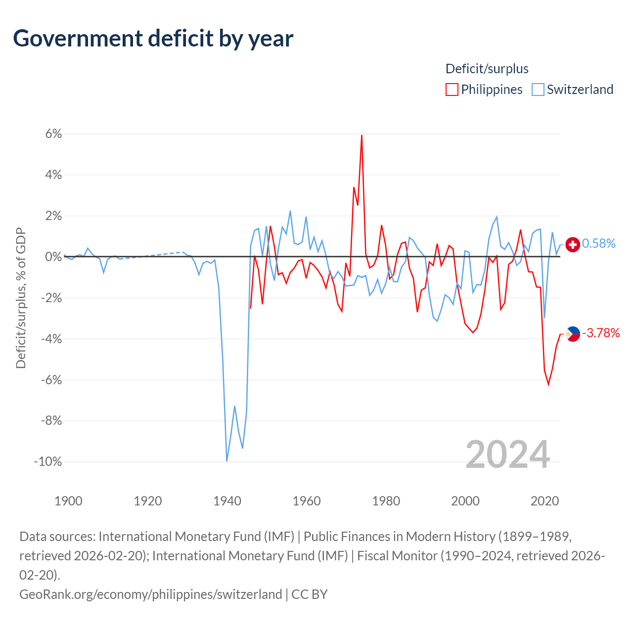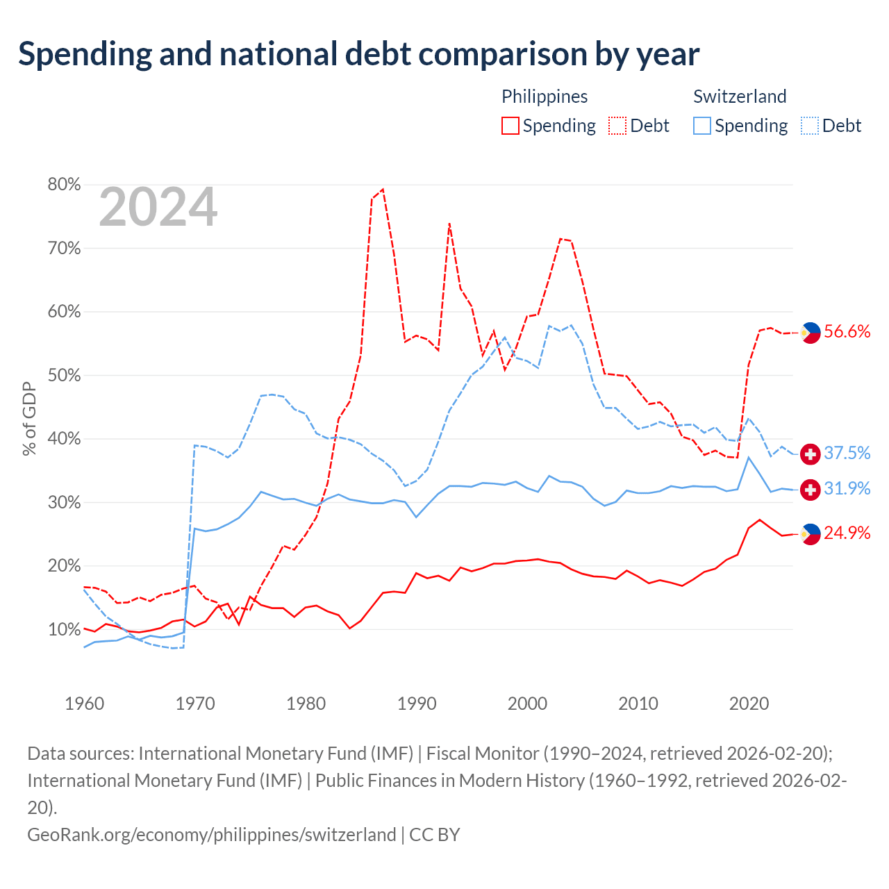The Philippines has $261B in government debt (56.6% of GDP), compared to $351B (37.5% of GDP) in Switzerland.