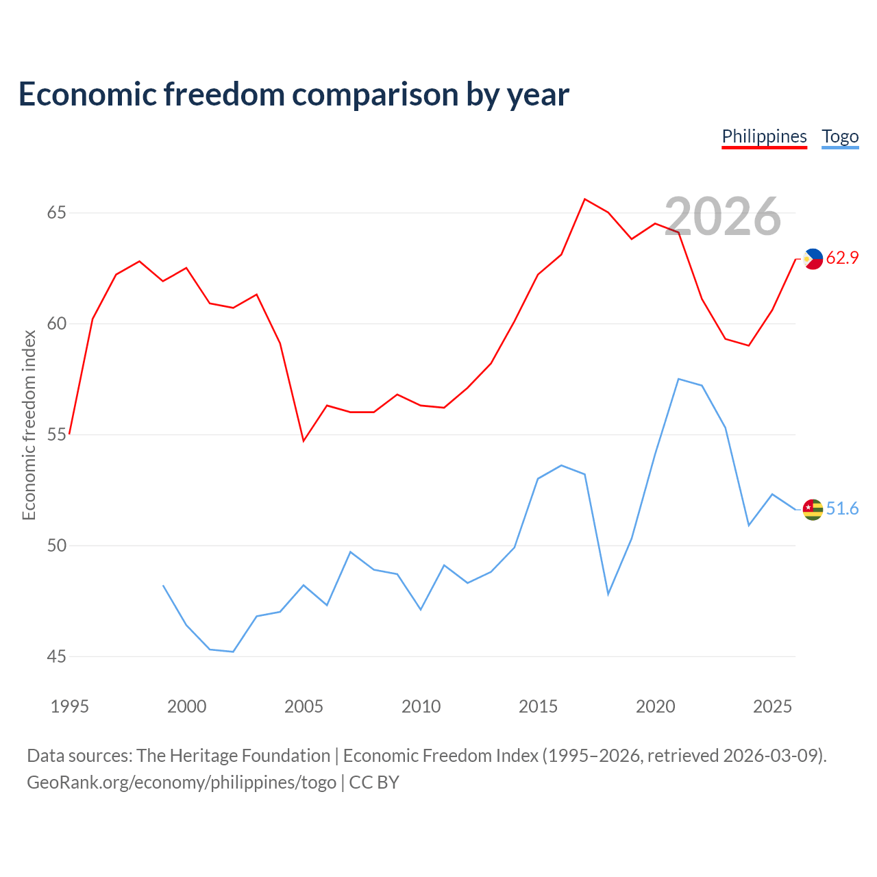 The Economic Freedom Index for the Philippines is 62.9, ranking 85/197, compared to 51.6 for Togo, ranking 153/197. The chart above displays a comparison of annual changes in economic freedom indexes.