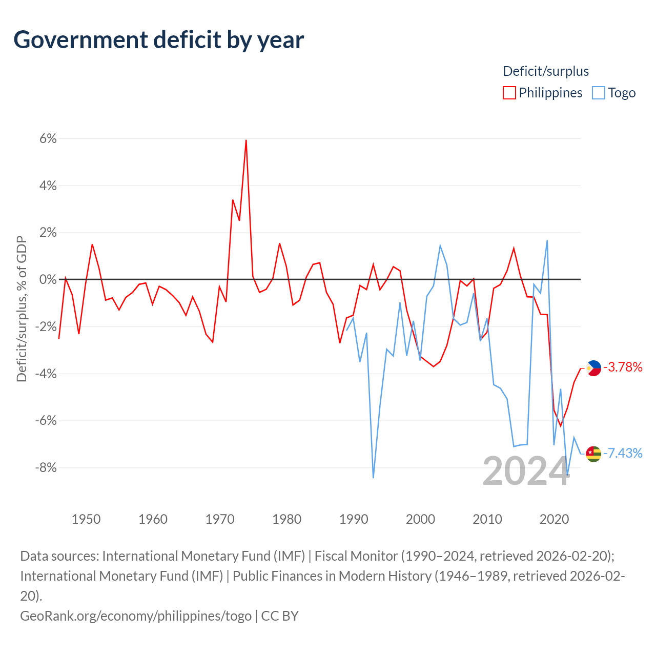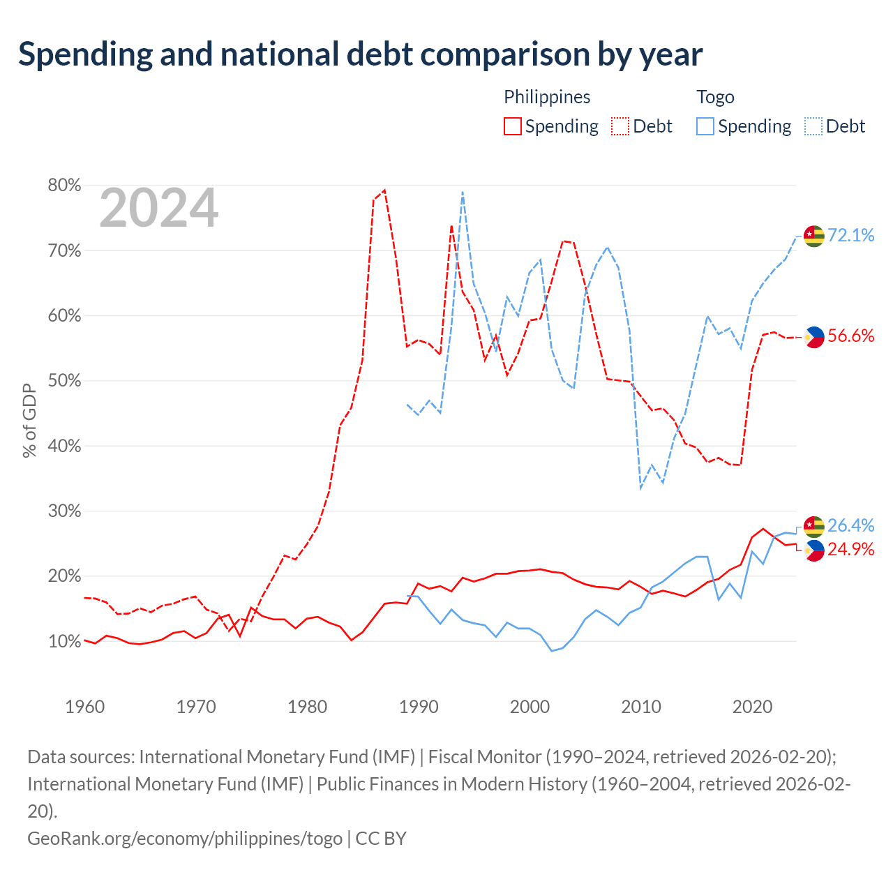 The Philippines has $261B in government debt (56.6% of GDP), compared to $7.68B (72.1% of GDP) in Togo.