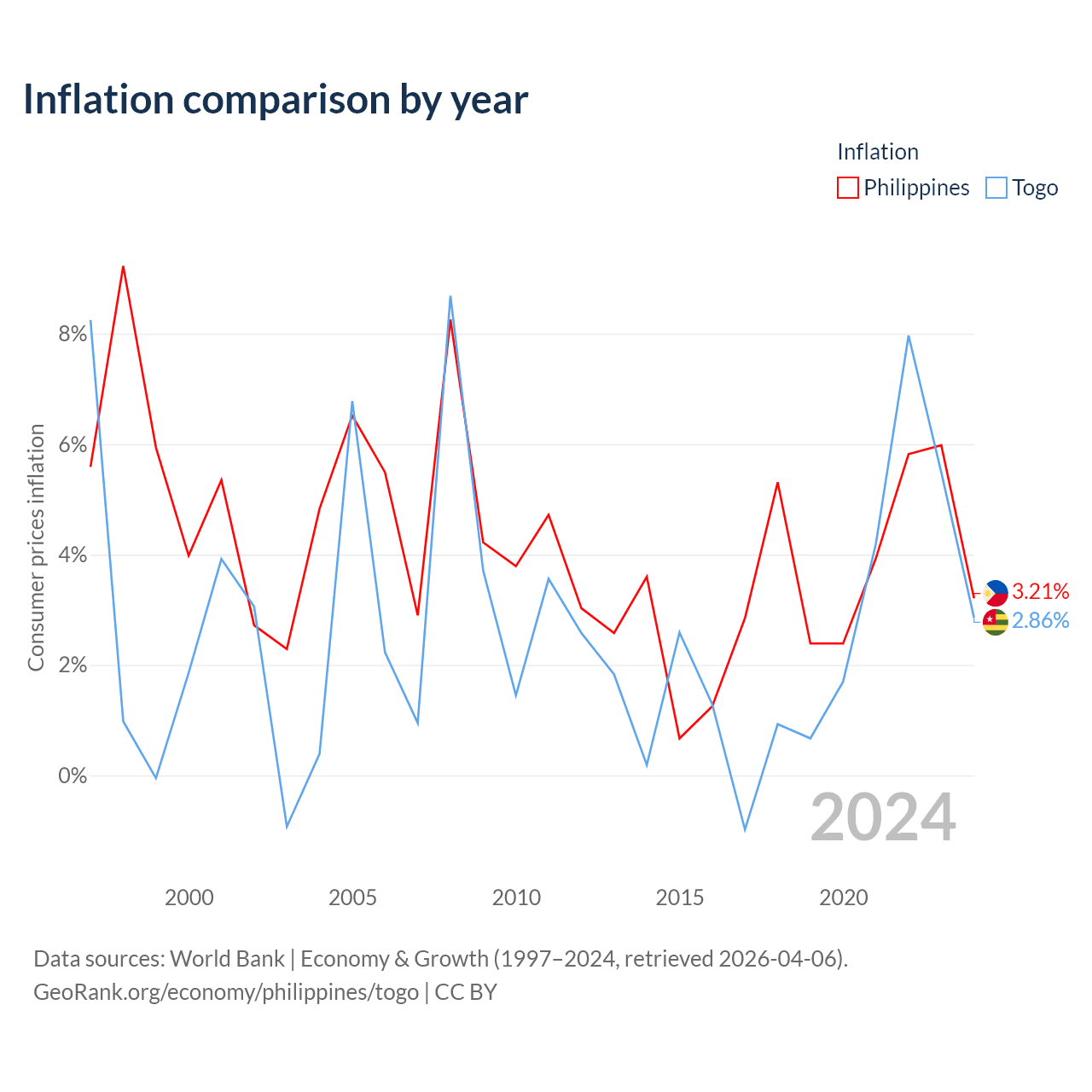 The Philippines has a GDP of $462B compared to $10.7B for Togo, ranking 35/197 and 154/197 by economy size, respectively.