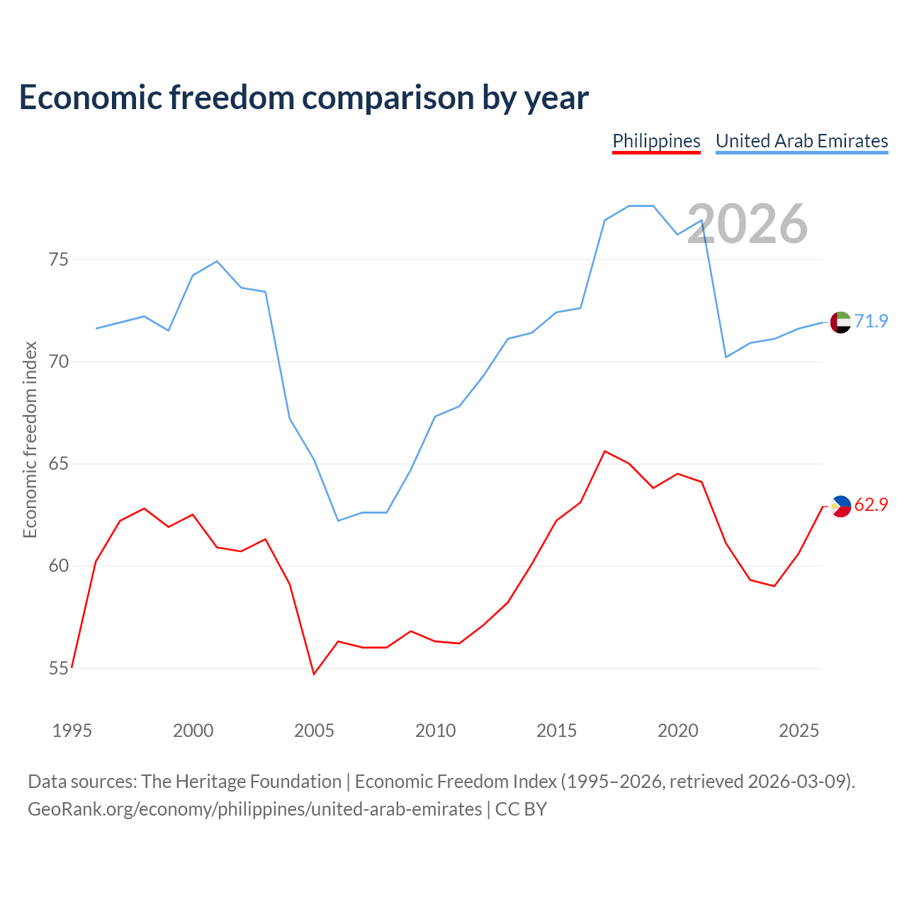 The Economic Freedom Index for the Philippines is 62.9, ranking 85/197, compared to 71.9 for the United Arab Emirates, ranking 29/197. The chart above displays a comparison of annual changes in economic freedom indexes.