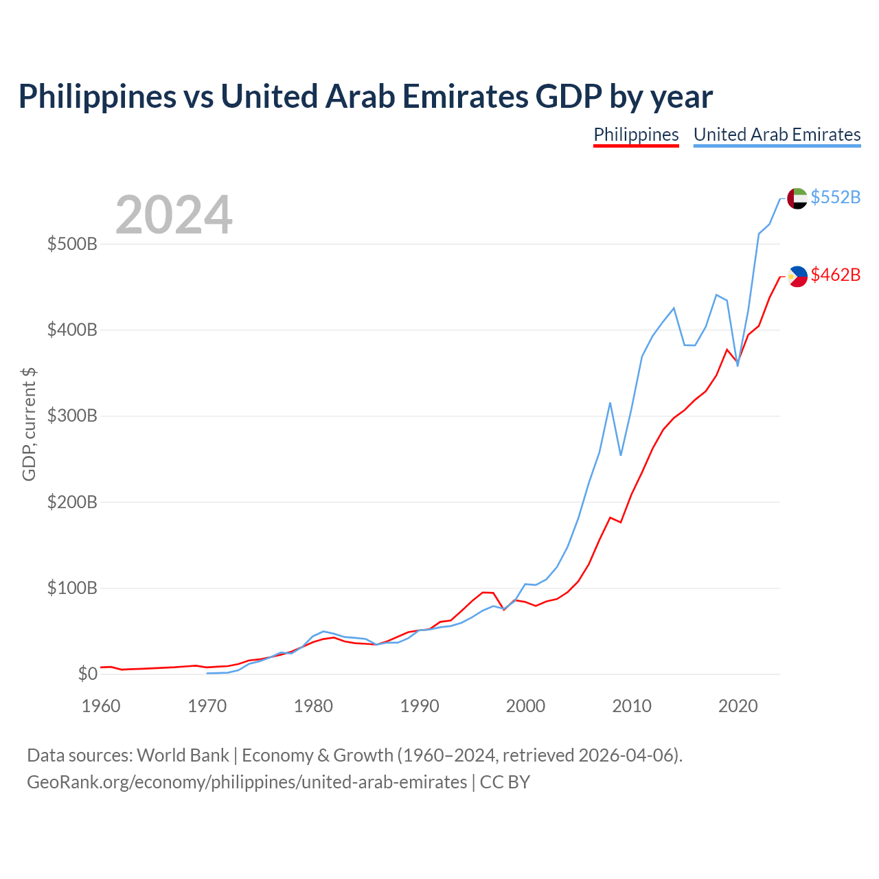 The Philippines has a GDP of $462B compared to $552B for the United Arab Emirates, ranking 35/197 and 27/197 by economy size, respectively.