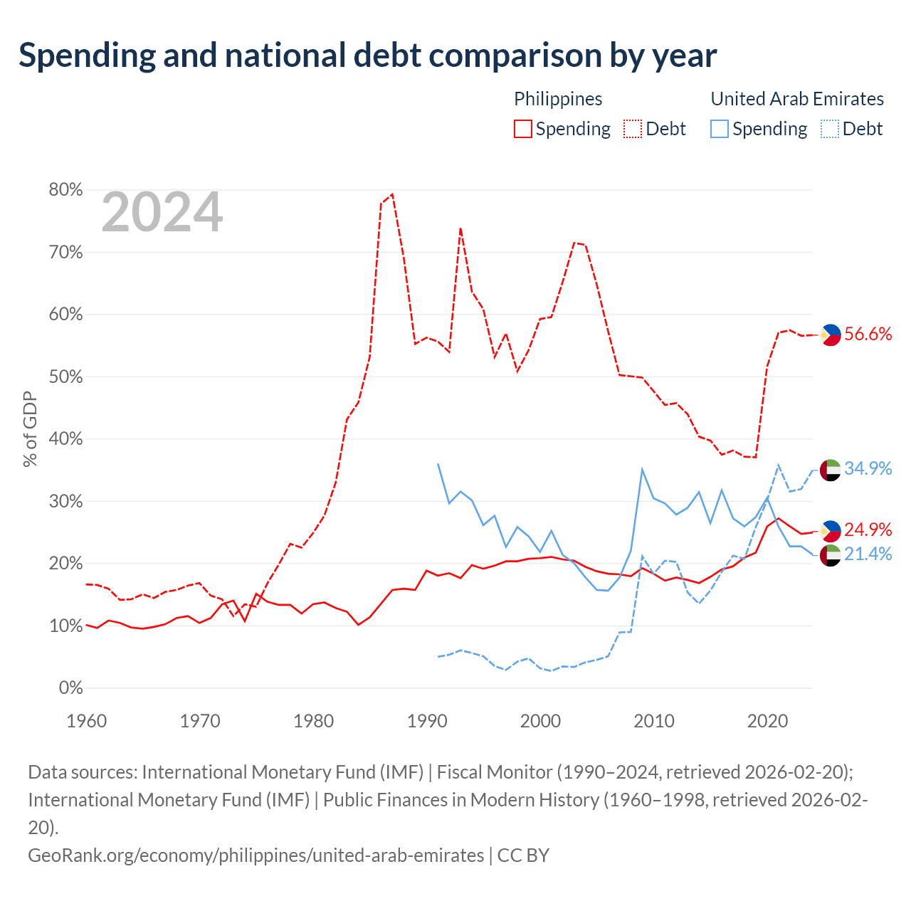 The Philippines has $261B in government debt (56.6% of GDP), compared to $193B (34.9% of GDP) in the United Arab Emirates.