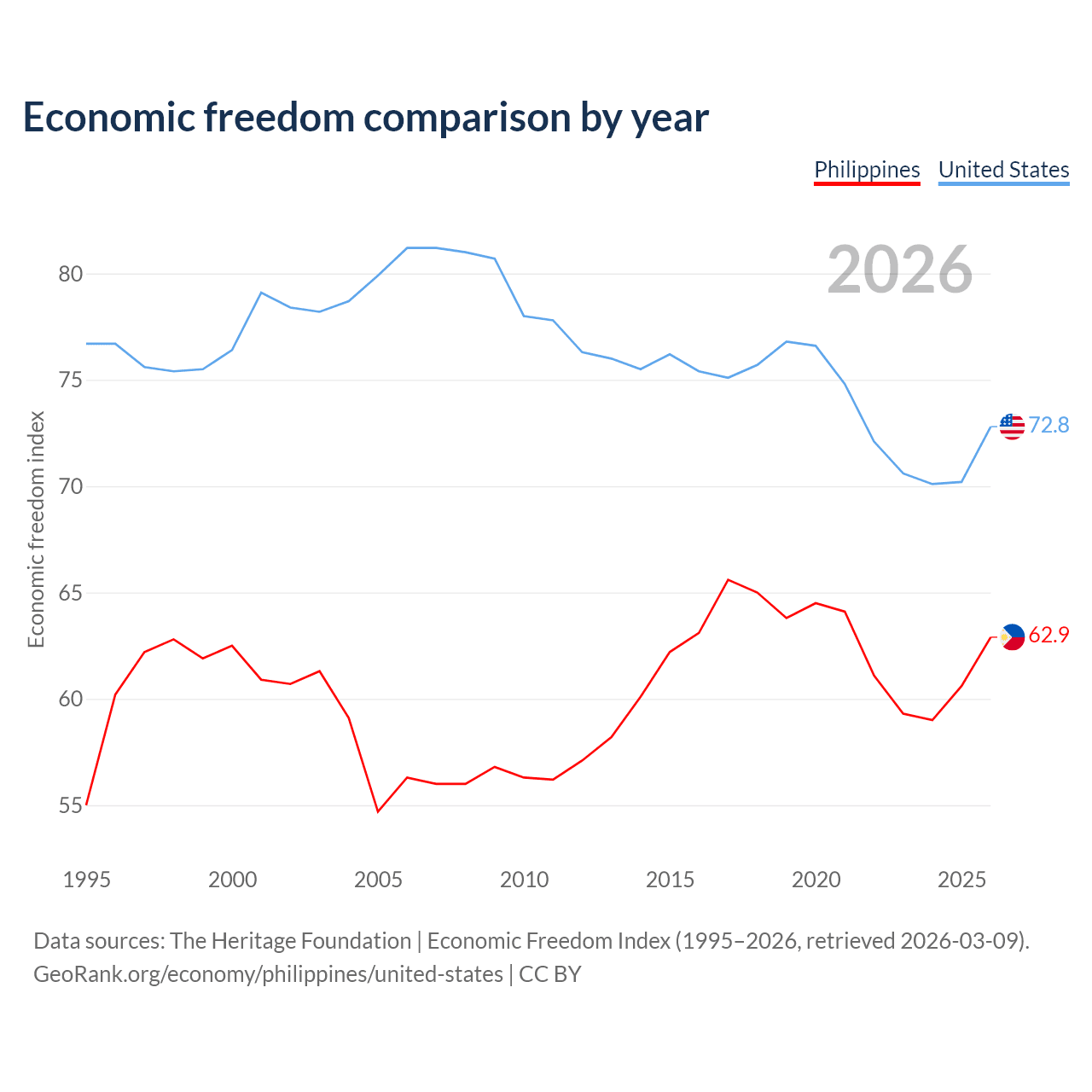 The Economic Freedom Index for the Philippines is 62.9, ranking 85/197, compared to 72.8 for the United States, ranking 27/197. The chart above displays a comparison of annual changes in economic freedom indexes.