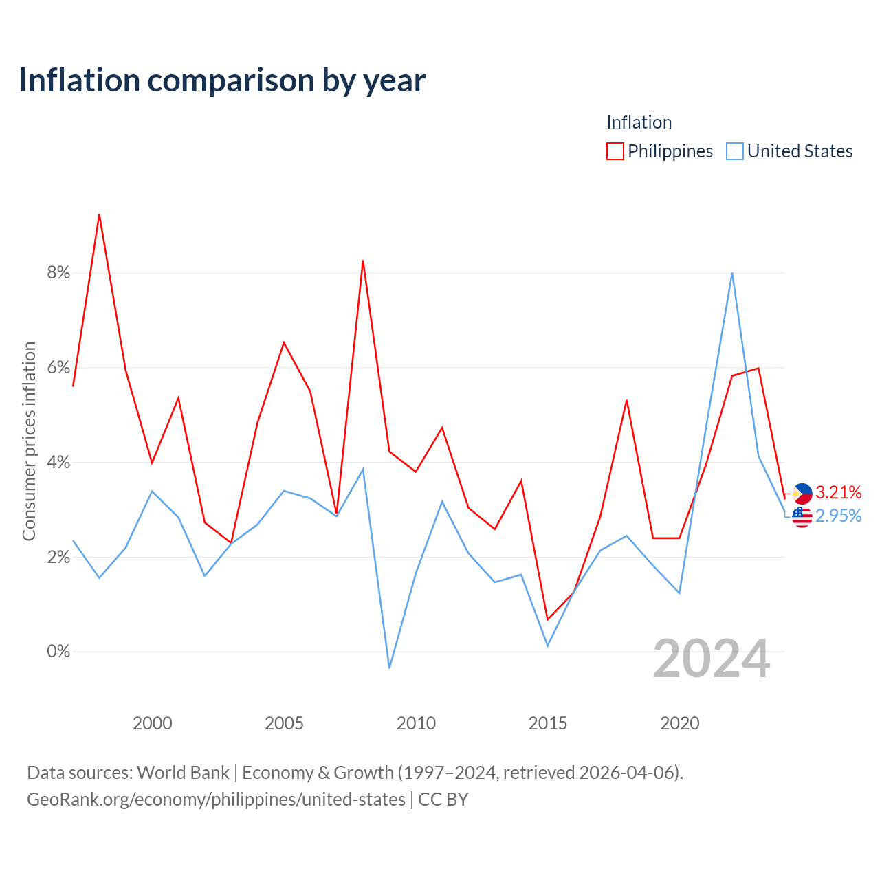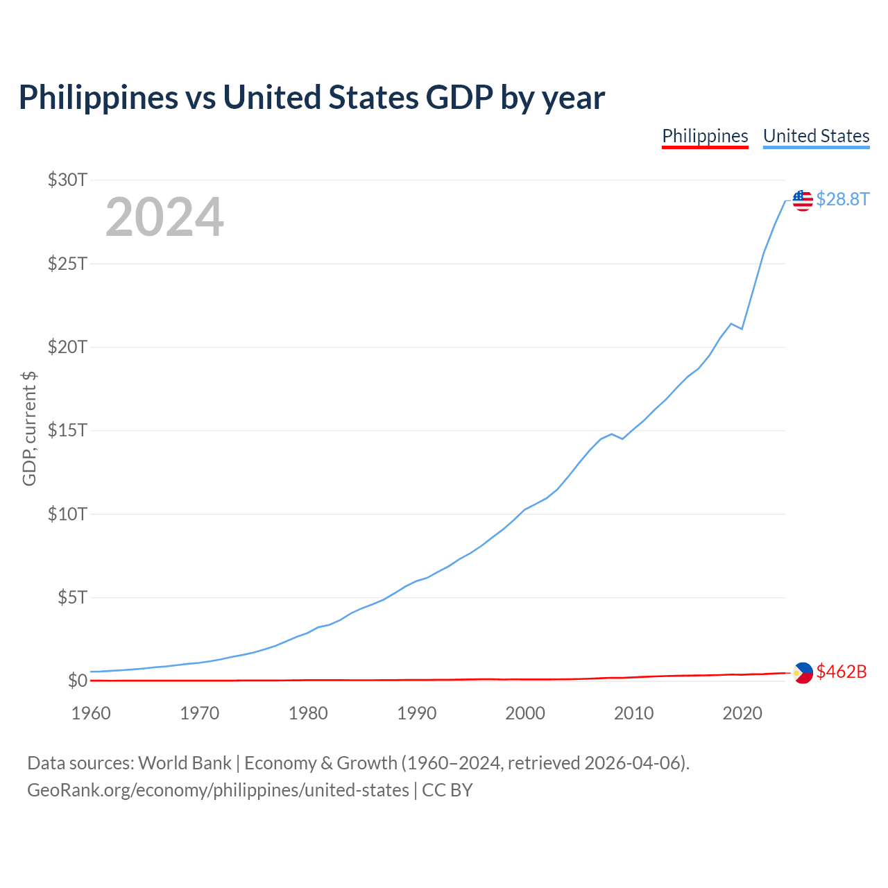 The Philippines has a GDP of $462B compared to $28.8T for the United States, ranking 35/197 and 1/197 by economy size, respectively.