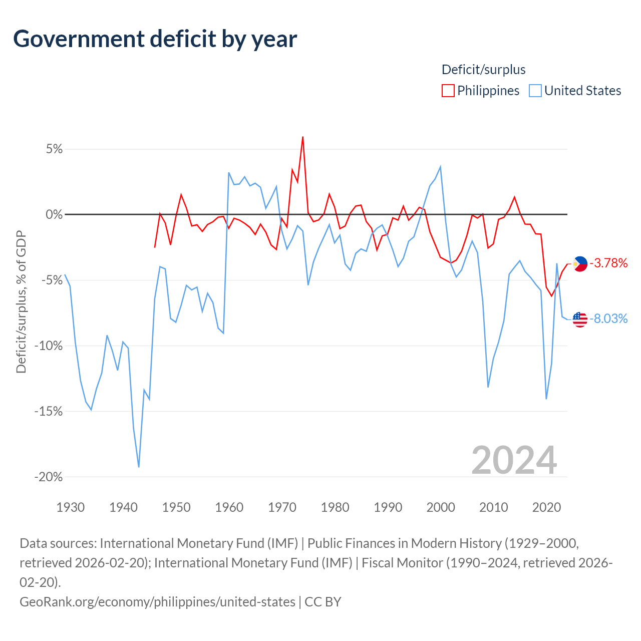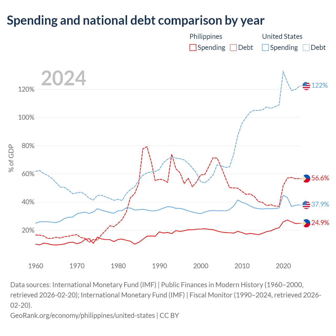 The Philippines has $261B in government debt (56.6% of GDP), compared to $35.2T (122.3% of GDP) in the United States.