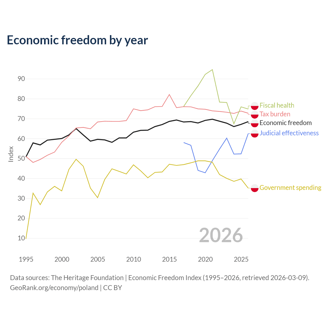 Poland is ranked 40/174 for economic freedom with a score of 68.5, compared to 77/162 and a score of 59.3 in 2006.