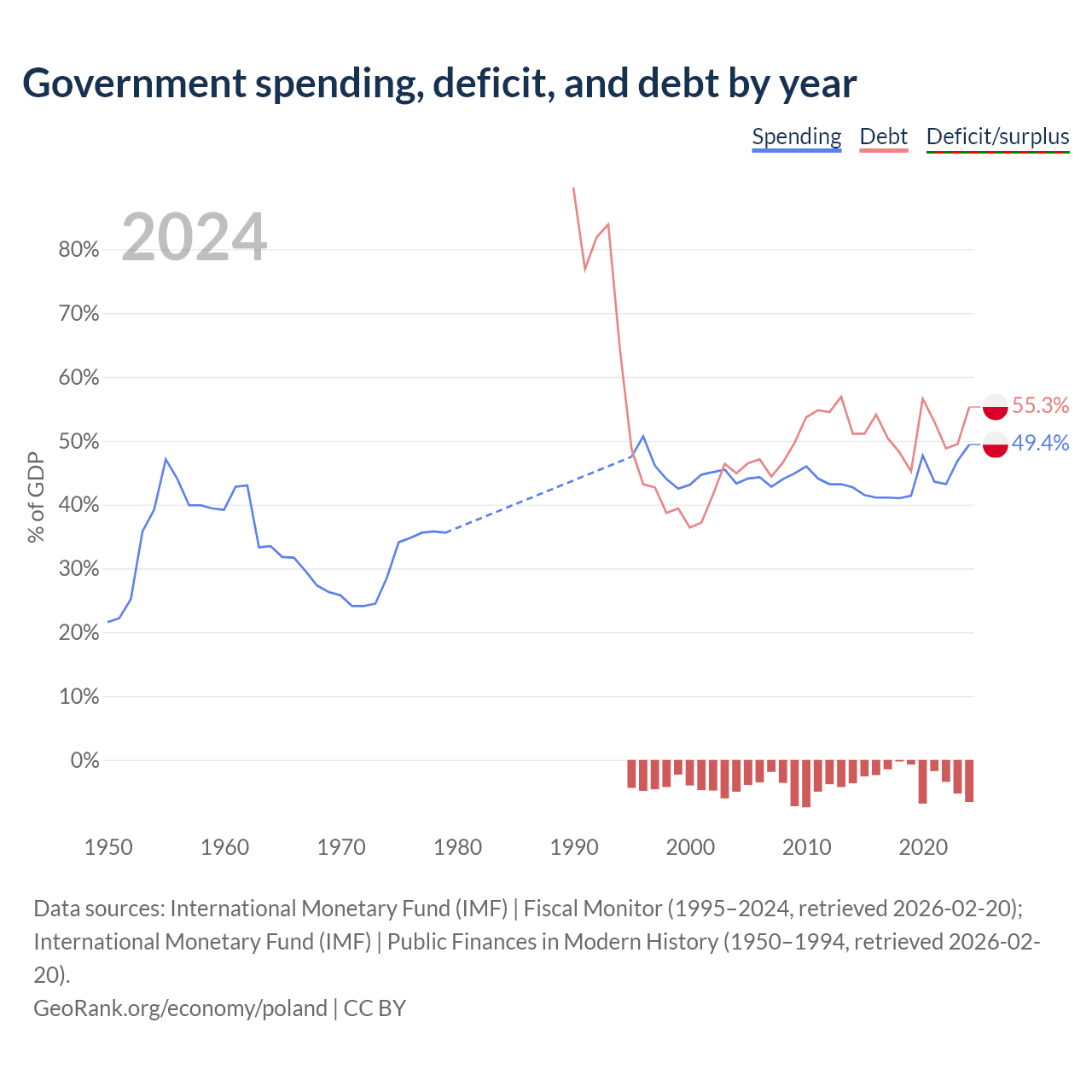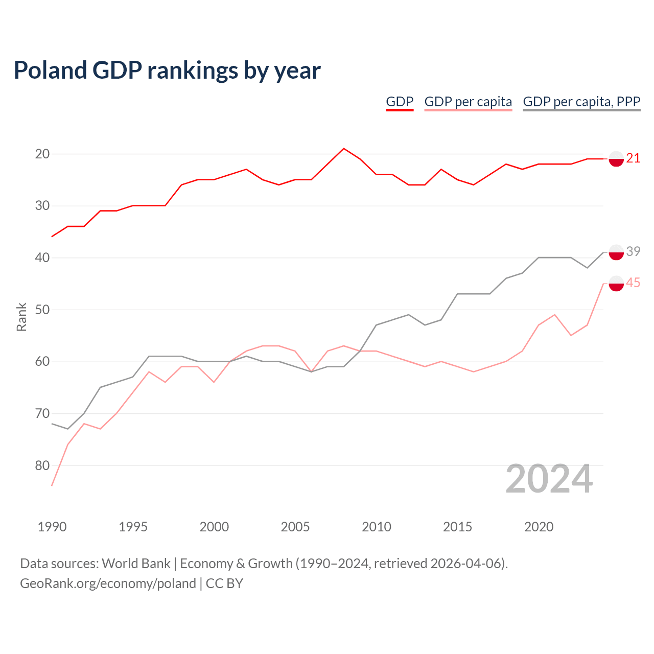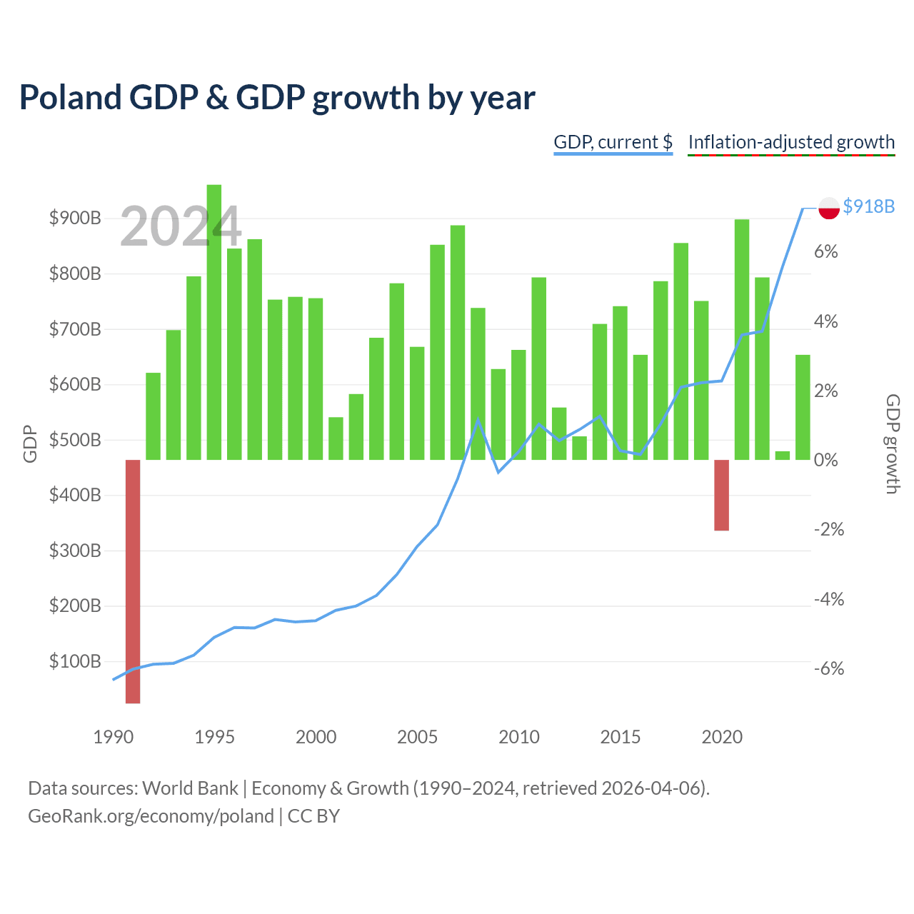 Poland ranked 21/197 by economy size with a GDP of $918B and 48/197 by GDP per capita at $25,104. Poland has $507B in government debt, with a debt-to-GDP ratio of 55.3%.