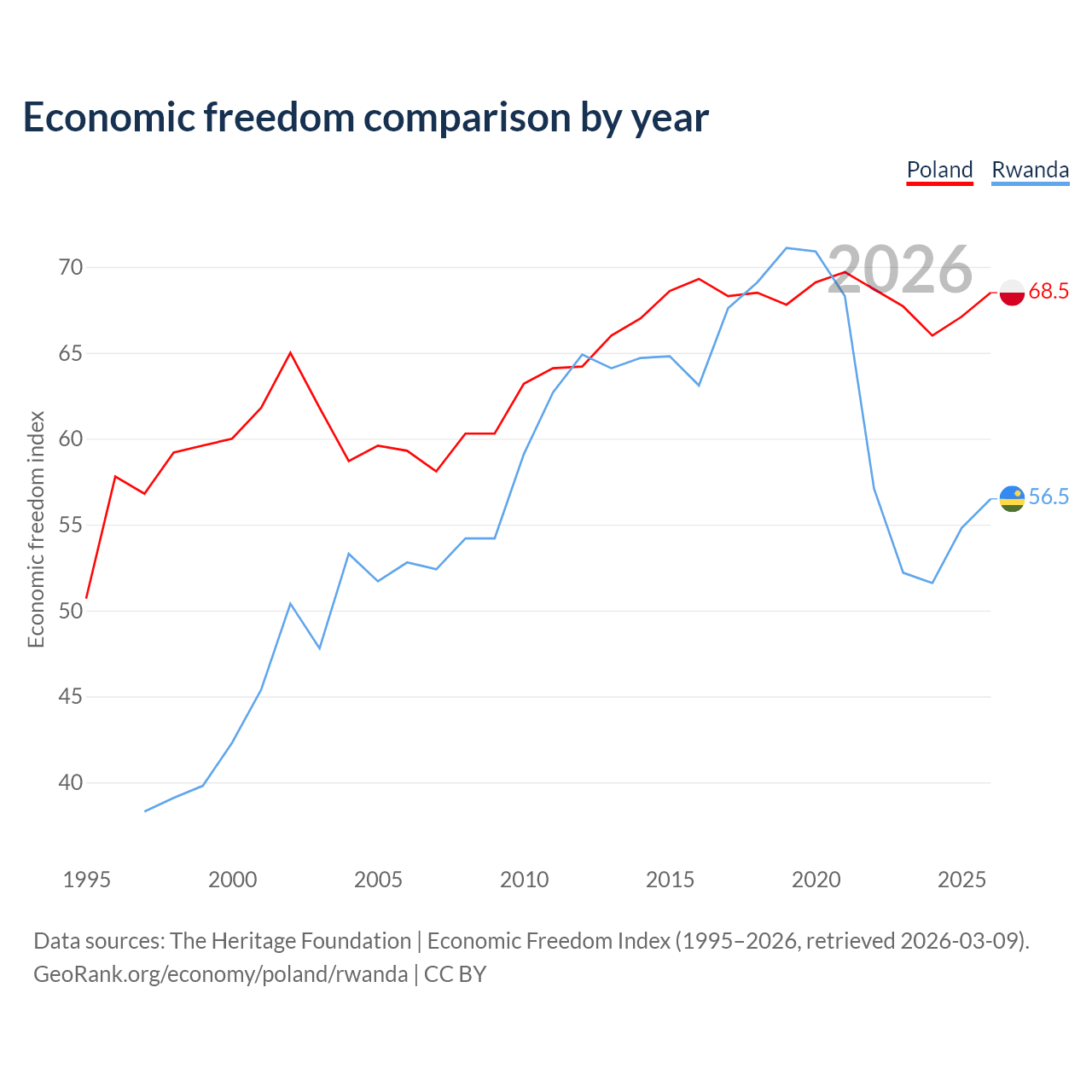 The Economic Freedom Index for Poland is 68.5, ranking 46/197, compared to 56.5 for Rwanda, ranking 121/197. The chart above displays a comparison of annual changes in economic freedom indexes.