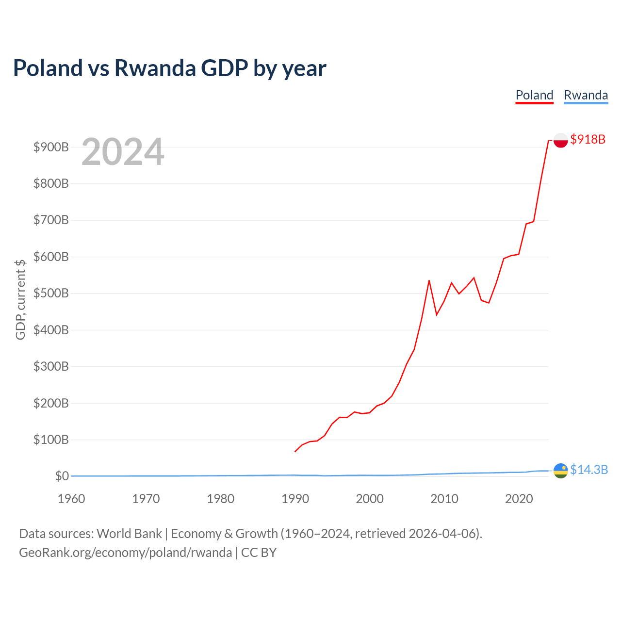 Poland has a GDP of $918B compared to $14.3B for Rwanda, ranking 21/197 and 144/197 by economy size, respectively.