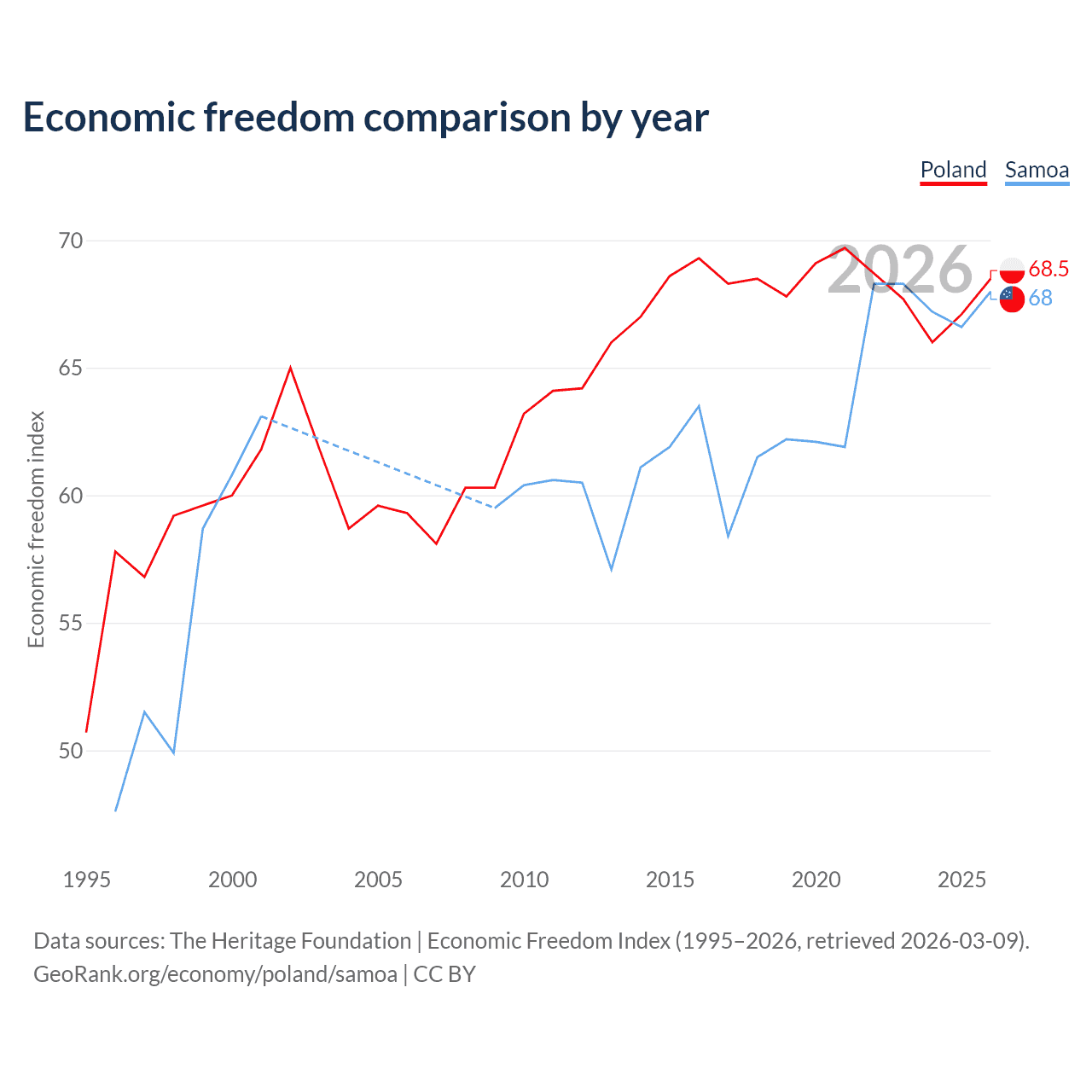 The Economic Freedom Index for Poland is 68.5, ranking 46/197, compared to 68 for Samoa, ranking 52/197. The chart above displays a comparison of annual changes in economic freedom indexes.