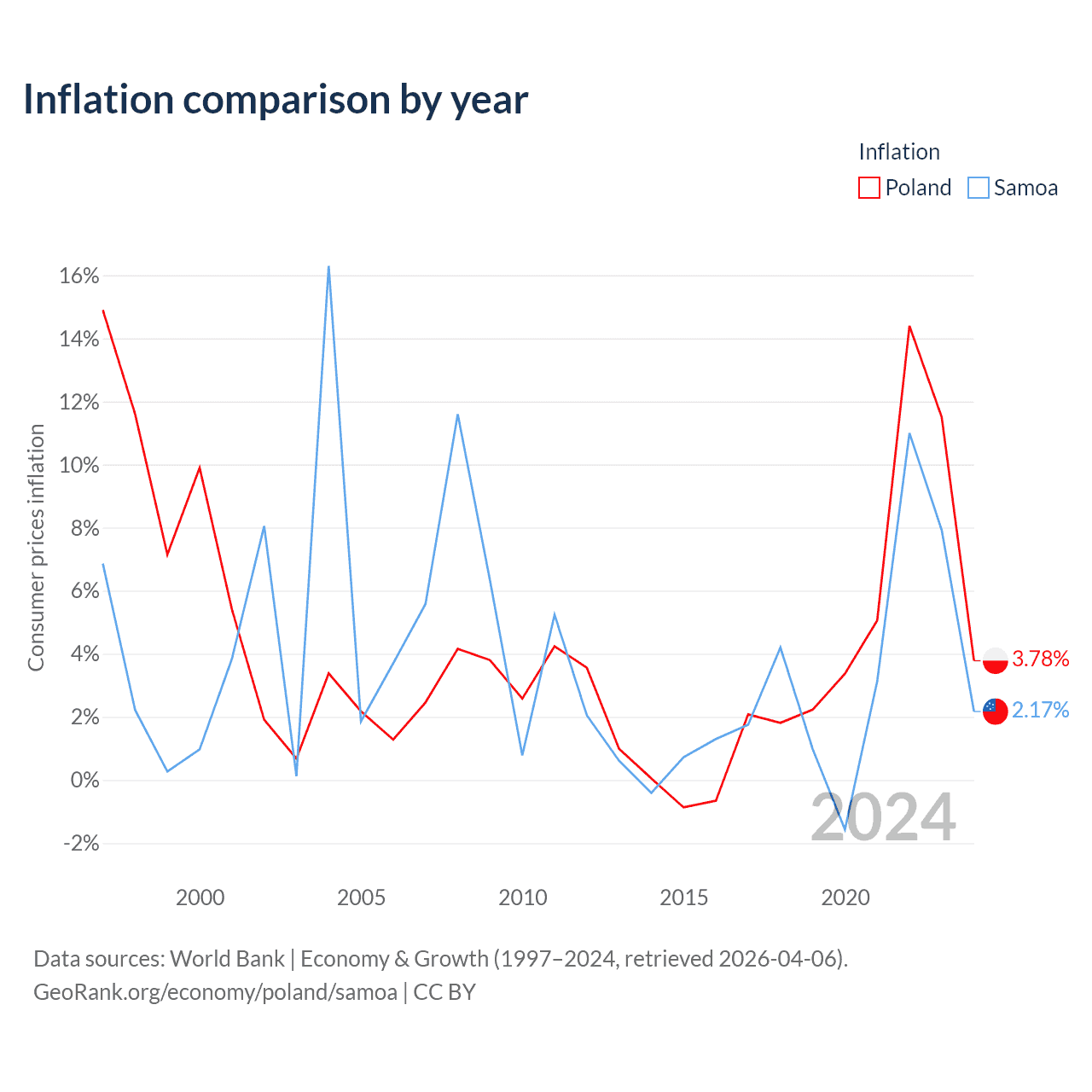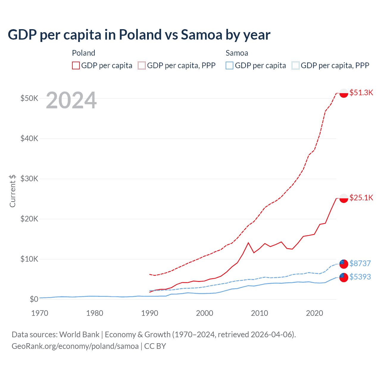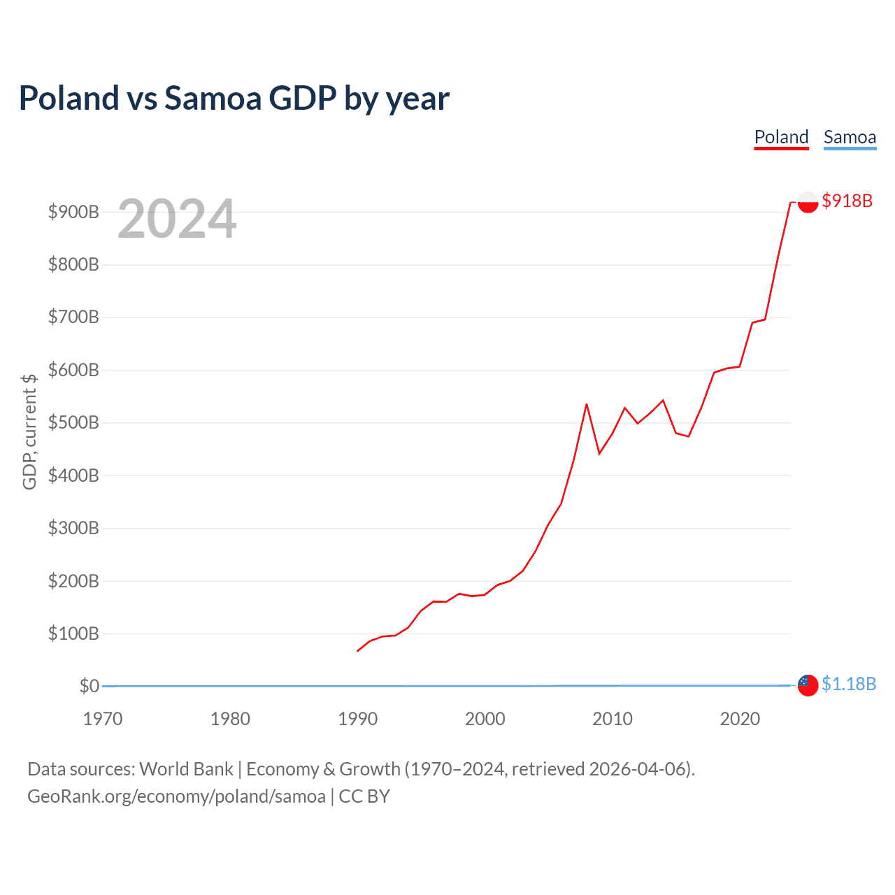 Poland has a GDP of $918B compared to $1.18B for Samoa, ranking 21/197 and 185/197 by economy size, respectively.