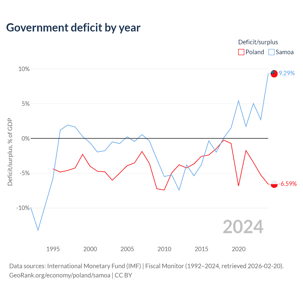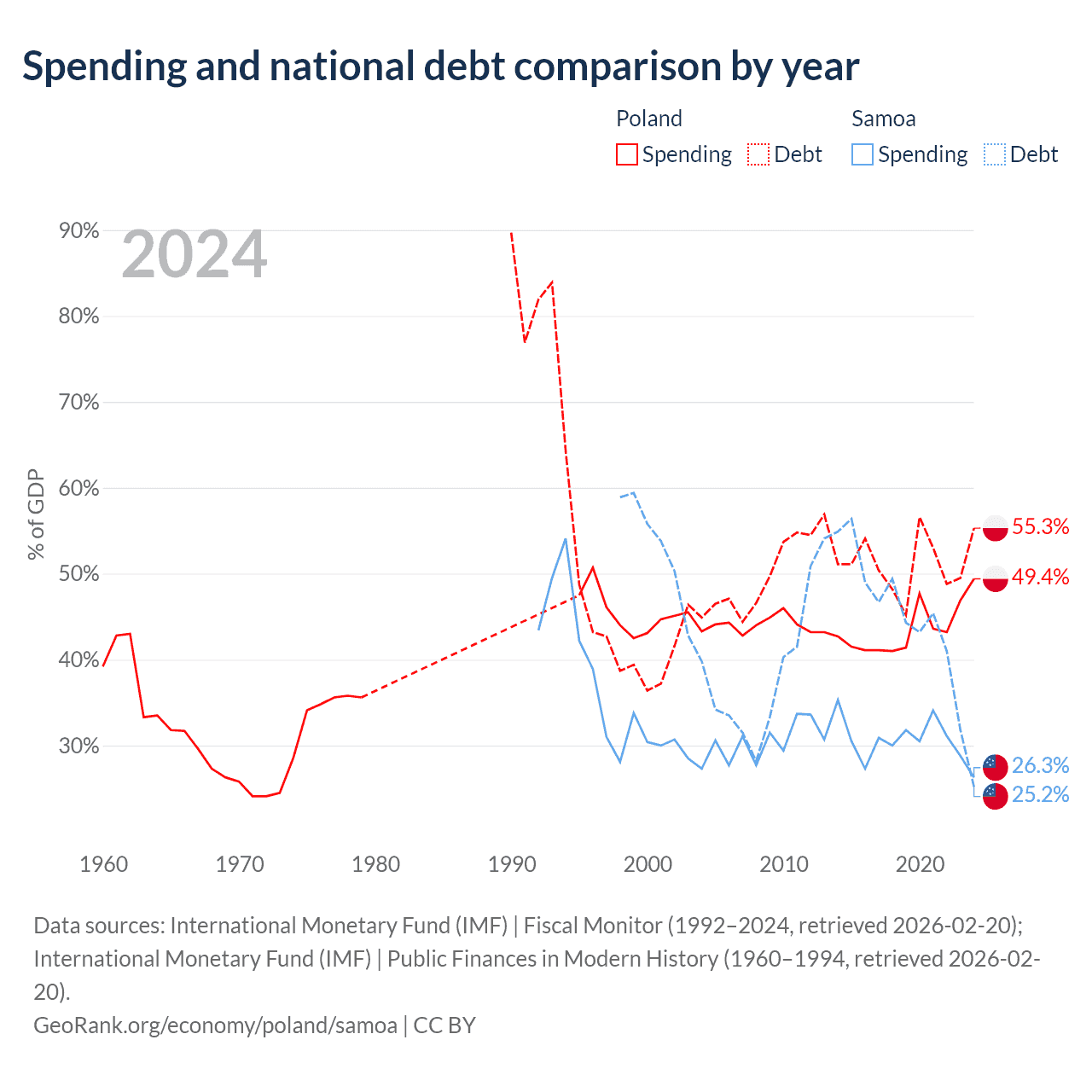 Poland has $507B in government debt (55.3% of GDP), compared to $296M (25.2% of GDP) in Samoa.