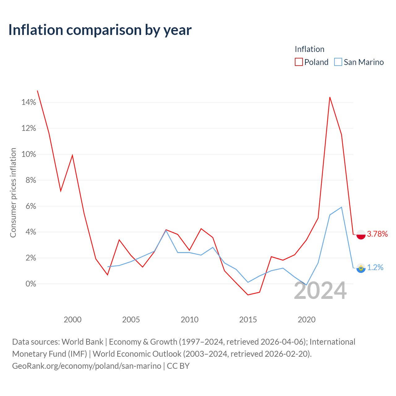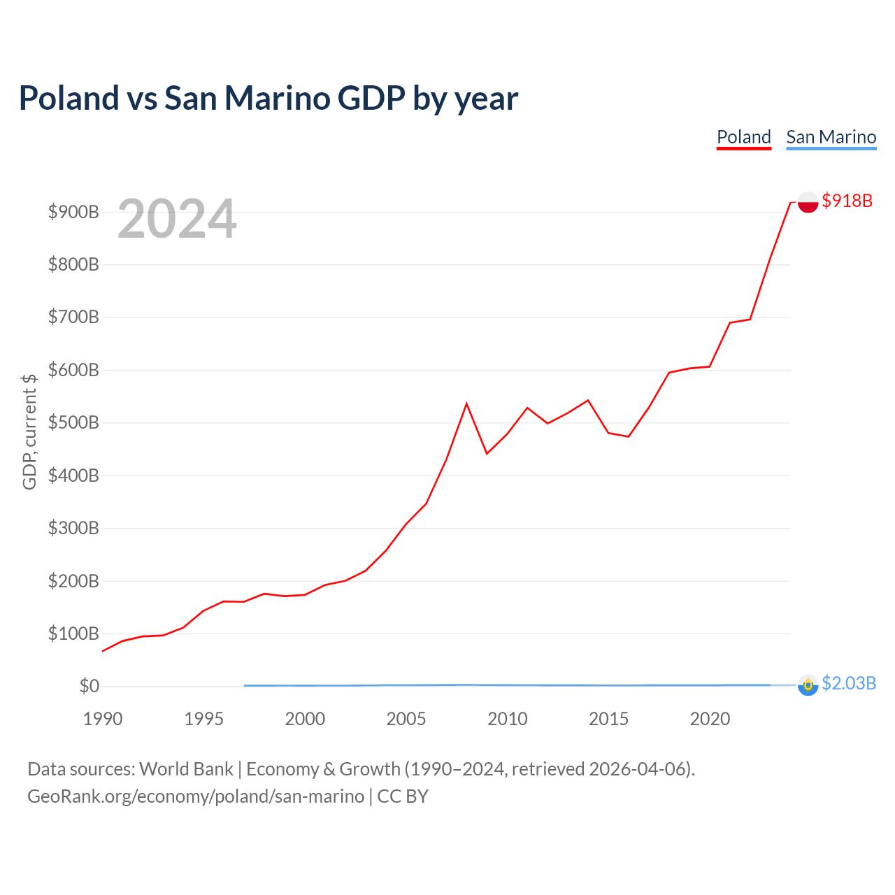 Poland has a GDP of $918B compared to $2.03B for San Marino, ranking 21/197 and 180/197 by economy size, respectively.
