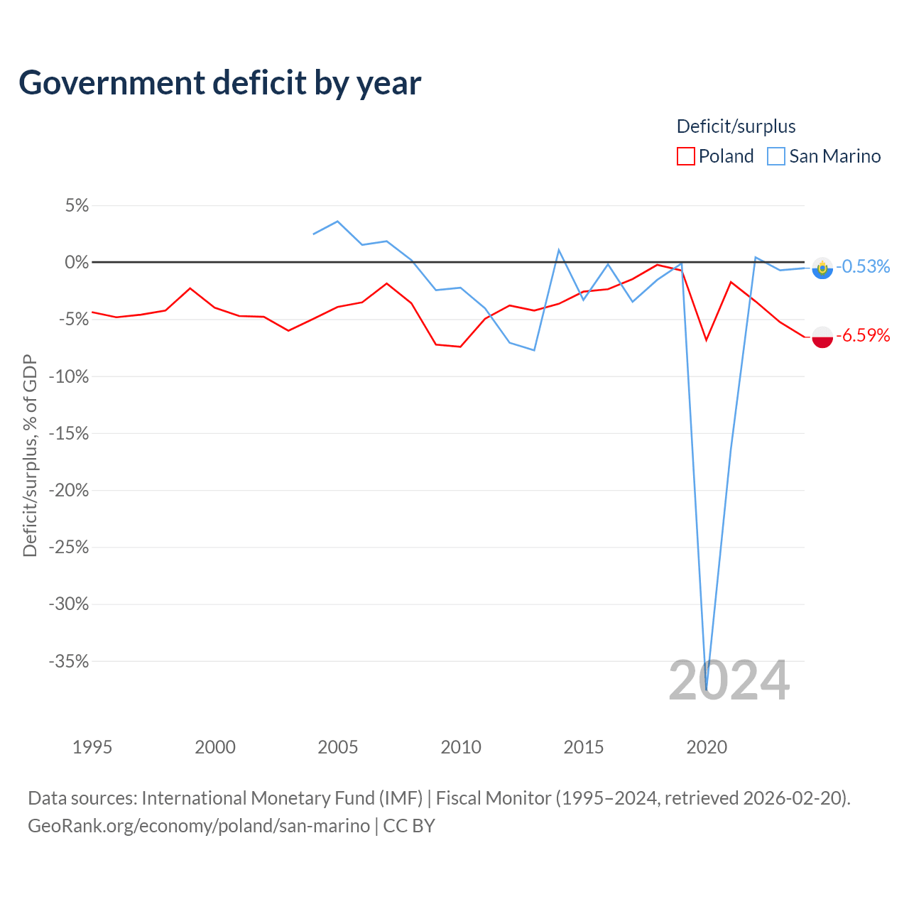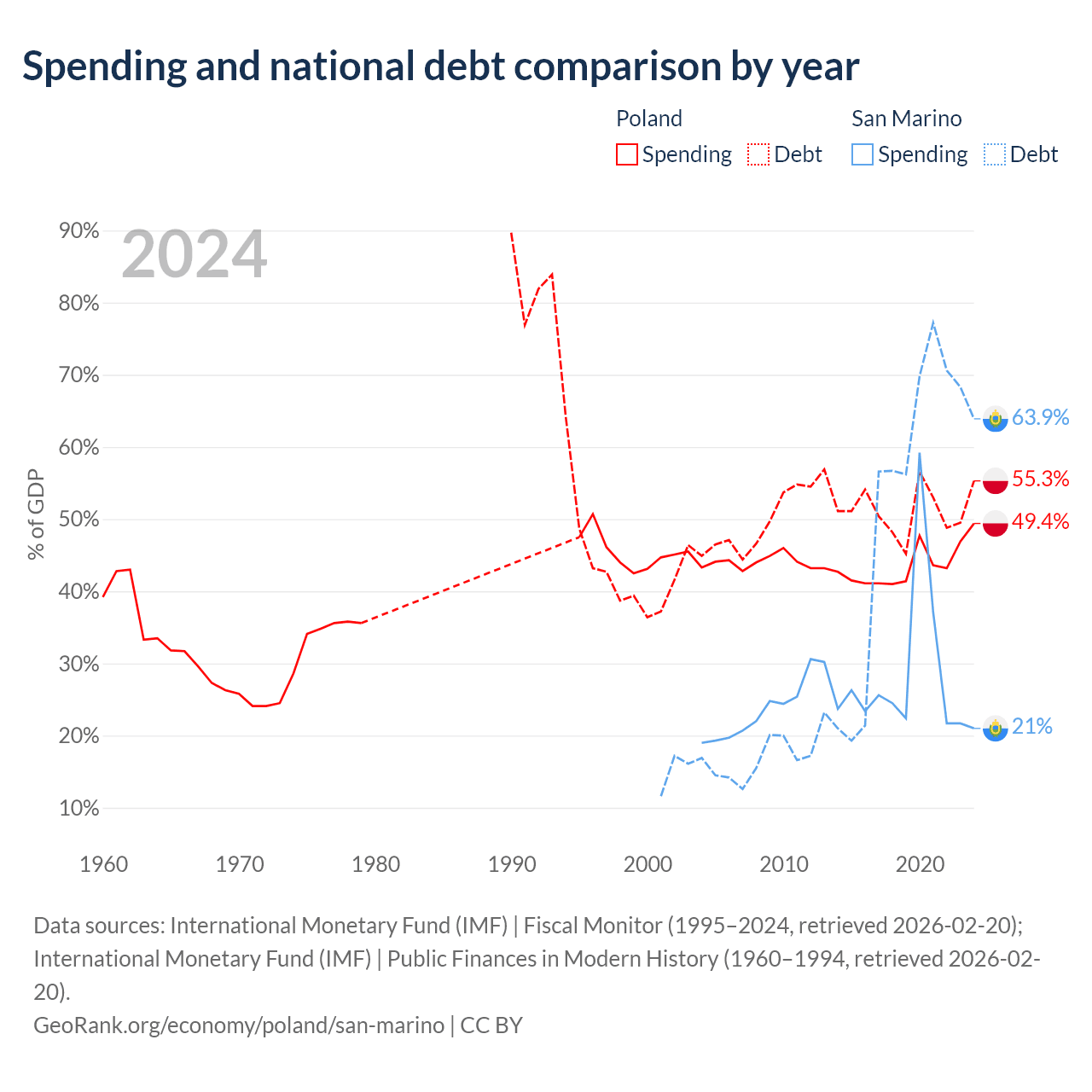Poland has $507B in government debt (55.3% of GDP), compared to $1.39B (63.9% of GDP) in San Marino.