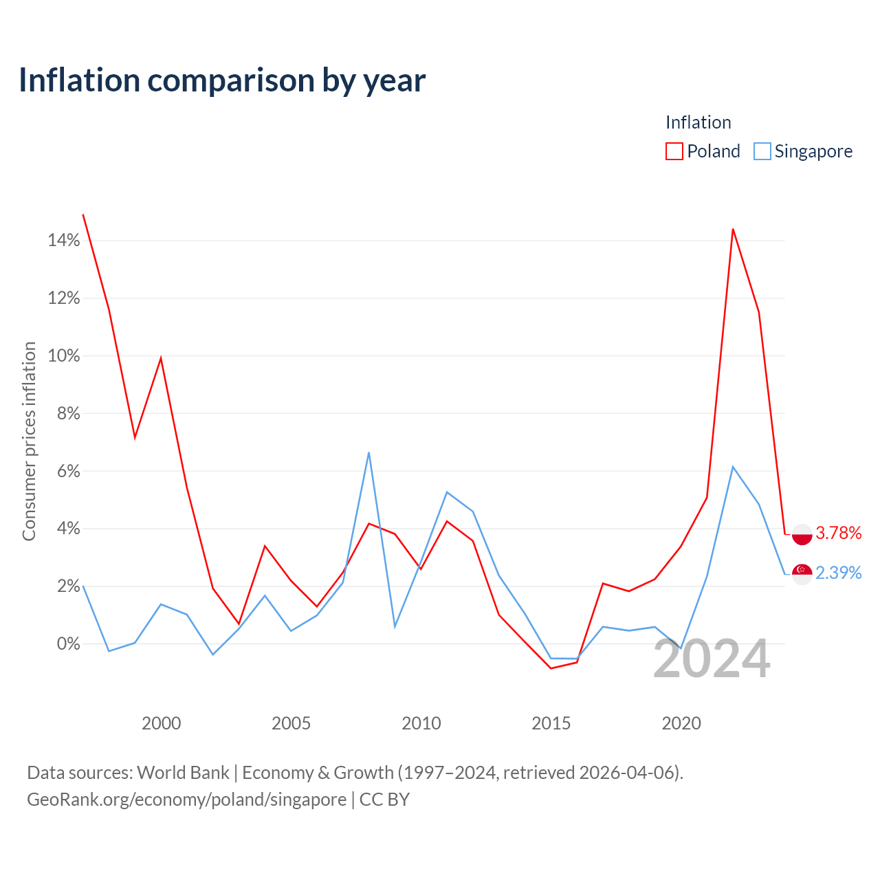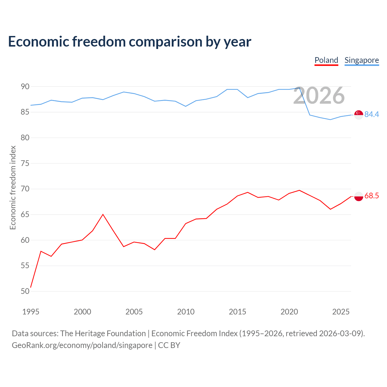The Economic Freedom Index for Poland is 68.5, ranking 46/197, compared to 84.4 for Singapore, ranking 1/197. The chart above displays a comparison of annual changes in economic freedom indexes.